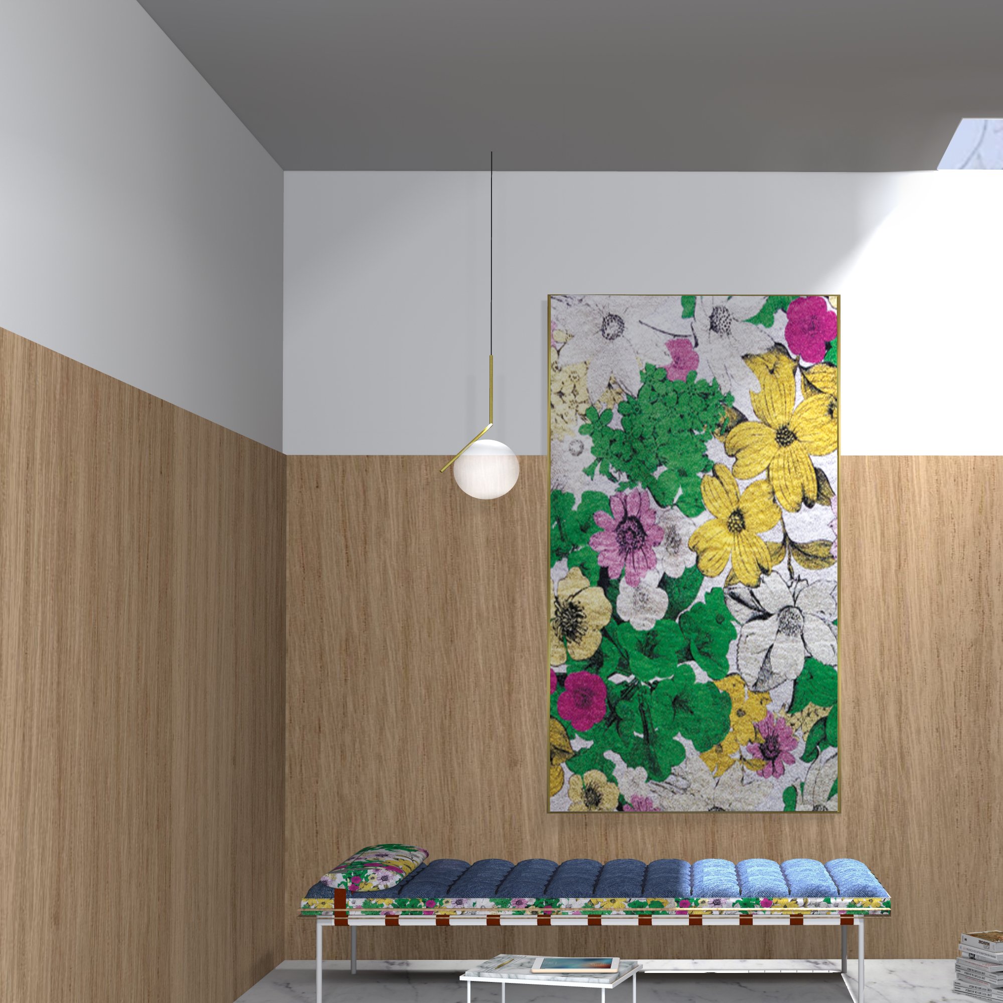 Matériaux piètement en métal. Matelas revêtu d'un tissu en jean et jacquard fleuri. Détails en cuir