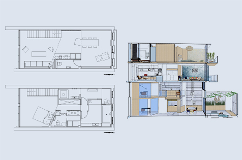 Plan au 1/50e avec proposition d’agencement (APS). Réalisation d’une planche d’ambiance avec choix de mobilier. Remise d’une shopping liste. Modélisation 3D avec perspective.