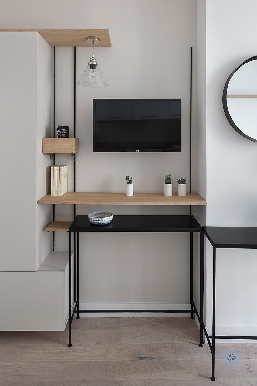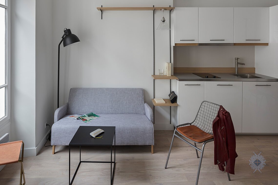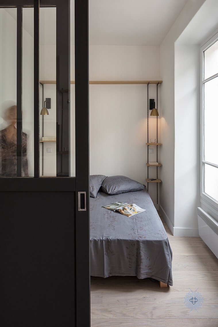 Rénovation complète pour ce petit deux-pièces de 28 m2 rue Saint-Dominique, destiné à la location. L'idée maîtresse était de libérer la lumière pour la laisser courir jusqu'au fond de l'appartement en ne fermant les espaces qu'avec des portes vitrées. Des agencements sur-mesure dessinés à partir de crémaillères et de tablettes ont été conçus à partir de lignes épurées pour ne pas encombrer ce petit espace.