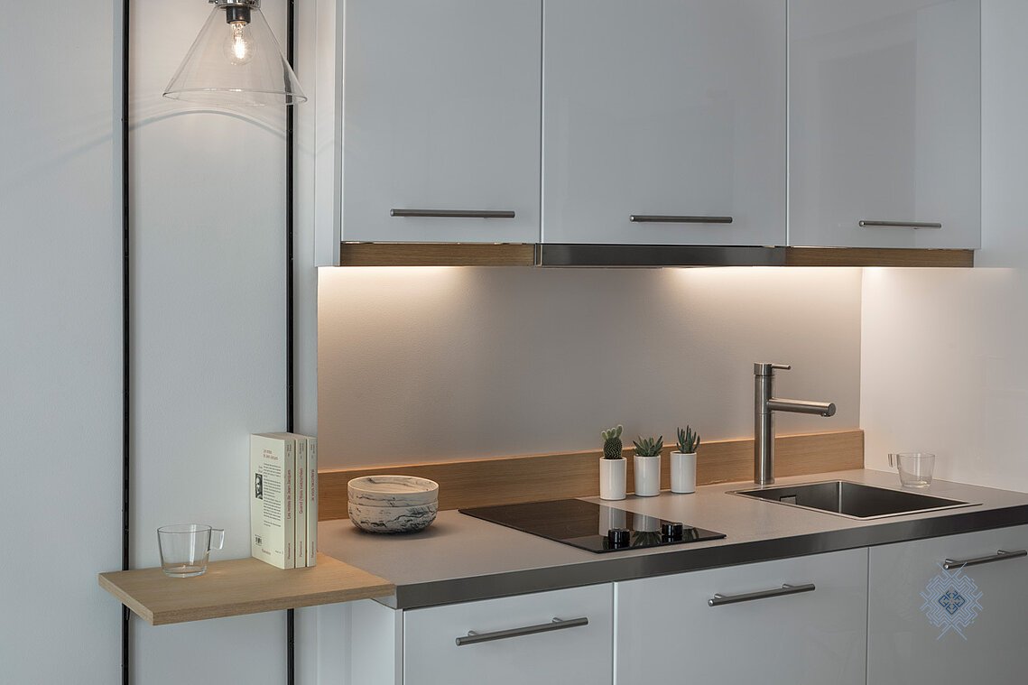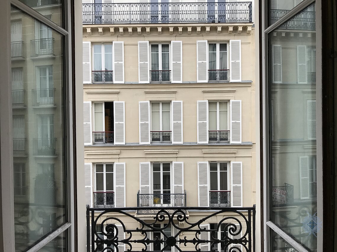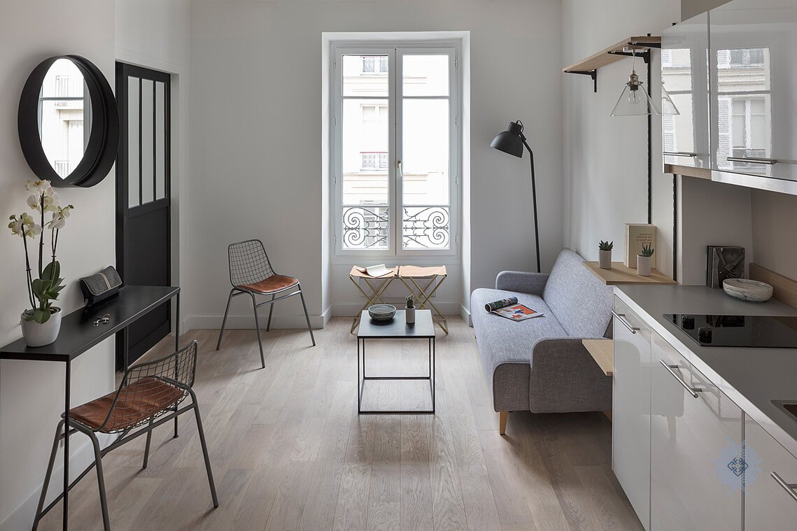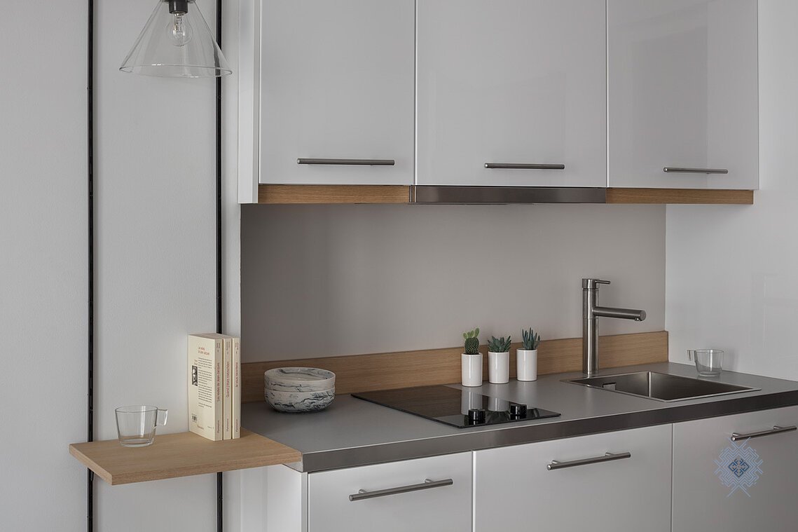 Rénovation complète pour ce petit deux-pièces de 28 m2 rue Saint-Dominique, destiné à la location. L'idée maîtresse était de libérer la lumière pour la laisser courir jusqu'au fond de l'appartement en ne fermant les espaces qu'avec des portes vitrées. Des agencements sur-mesure dessinés à partir de crémaillères et de tablettes ont été conçus à partir de lignes épurées pour ne pas encombrer ce petit espace.