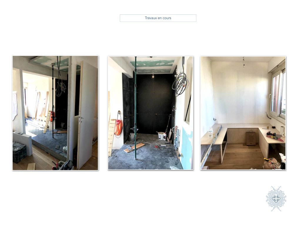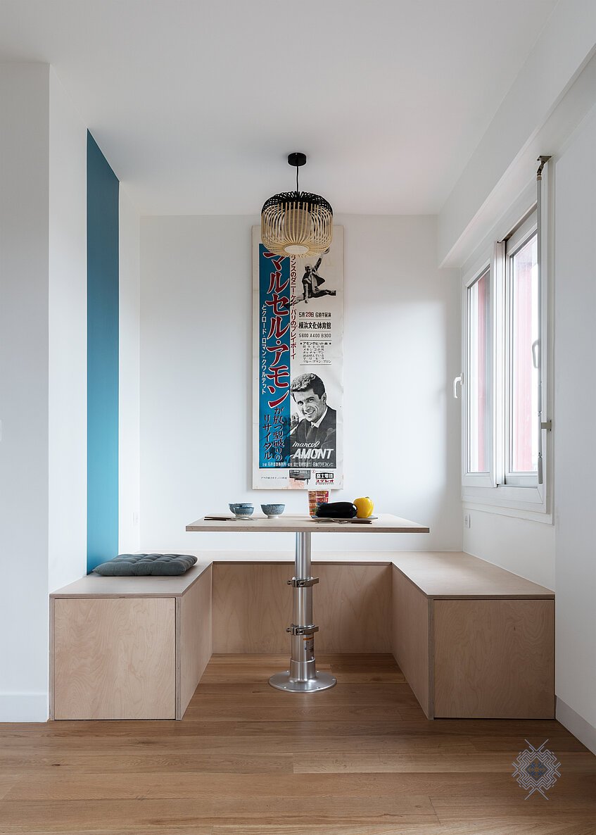 Conception complète pour la rénovation de cet appartement terrasse de 60 m2.Le propriétaire souhaitait épurer et moderniser les lieux en gagnant en sentiment d'espace. L'ancienne salle de bains a été réinvestie en salle de thé à la japonaise avec une estrade intégrant une table escamotable qui, repliée, devient un espace de détente sur tatami. Une salle de douche a été imaginée dans le prolongement de la chambre en gagnant l'espace d'un petit couloir et celui d'un dressing. Enfin, pour ce guitariste, une pièce totalement insonorisée a été créée dans l'espace de vie, avec une cloison en origami élégamment intégrée à l'espace en y apportant mouvement et poésie. La large zone tampon de l'entrée entre la cuisine et le salon a été redéfinie en dressing et bureau/bibliothèque. Tous les espaces sont optimisés avec des fonctions bien identifiées tout en laissant circuler un maximum la lumière.