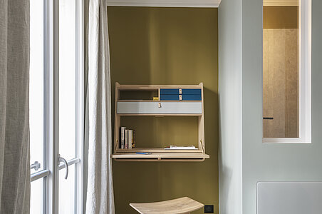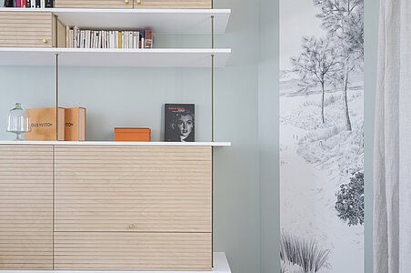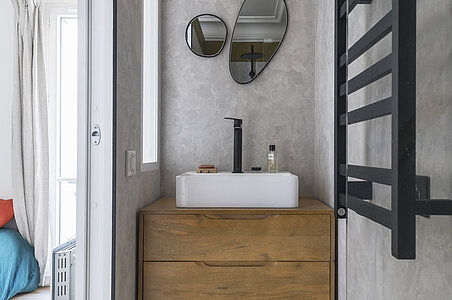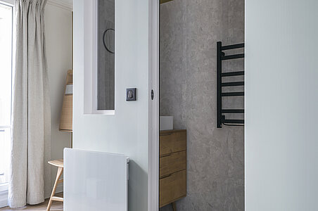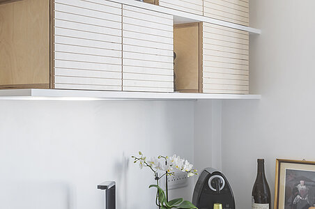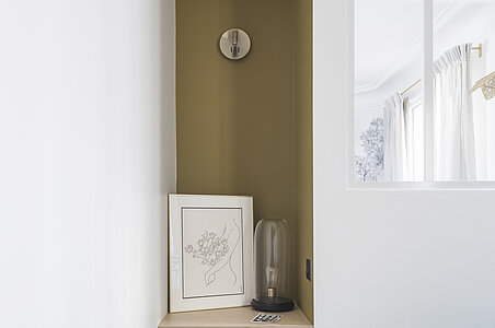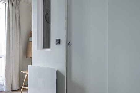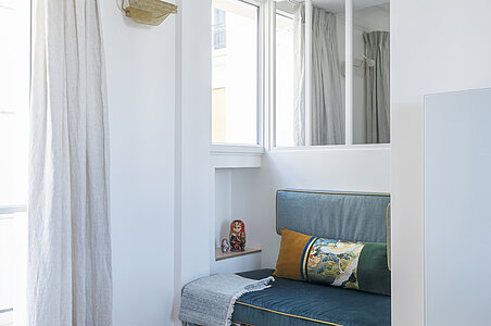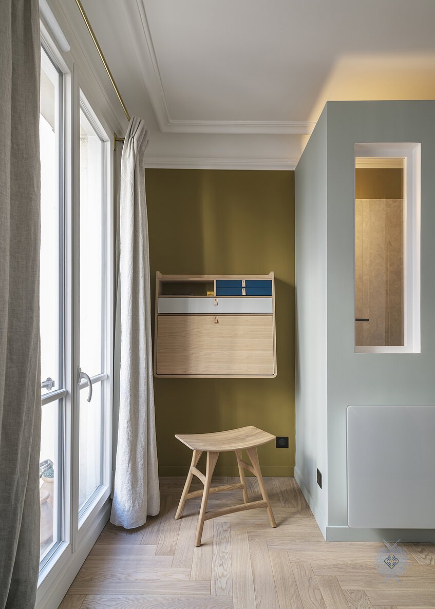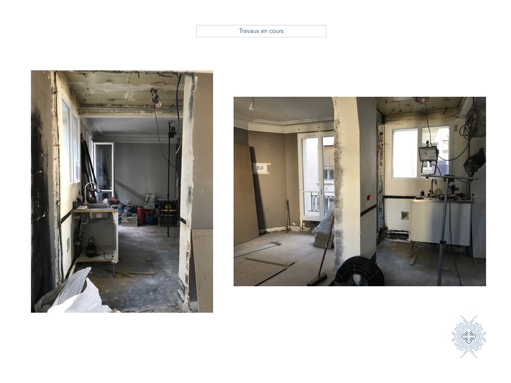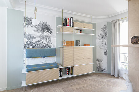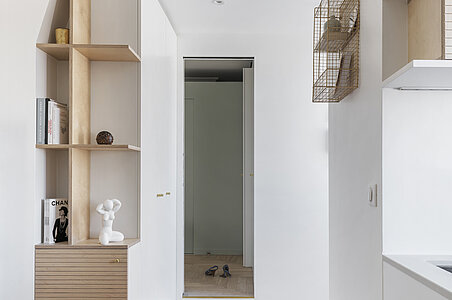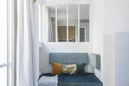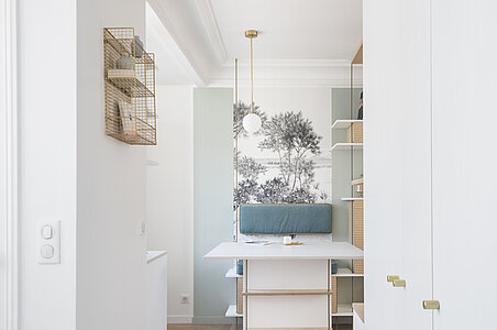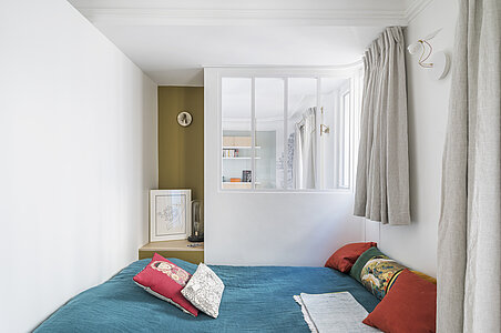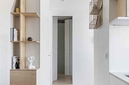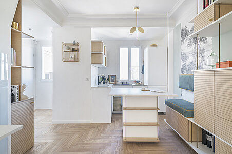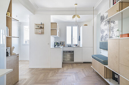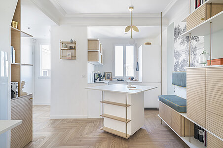 Rénovation complète pour cet appartement typique du quartier des Batignolles à Paris. Une quarantaine de mètres carrés à redistribuer pour profiter de la double exposition de l'appartement, agrandir l'espace de vie pour la propriétaire, toujours encline à cuisiner et à recevoir. L'espace intime a été surélevé sur une petite estrade qui marque les fonctions de la salle de douche, dressing et coin nuit. Pour autant aucune cloison ne vient arrêter le regard, la lumière circule partout par le jeu de vitrages qui viennent jouer avec la perspective et créent ainsi un sentiment d'espace et de luminosité.