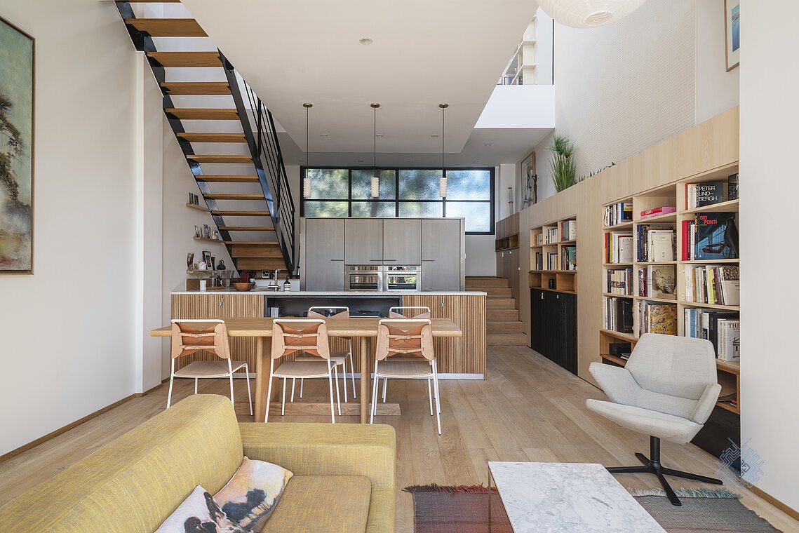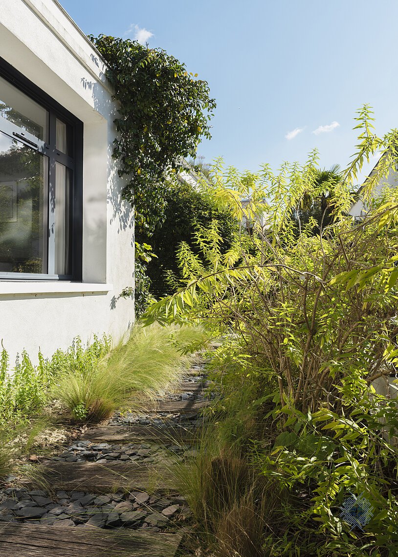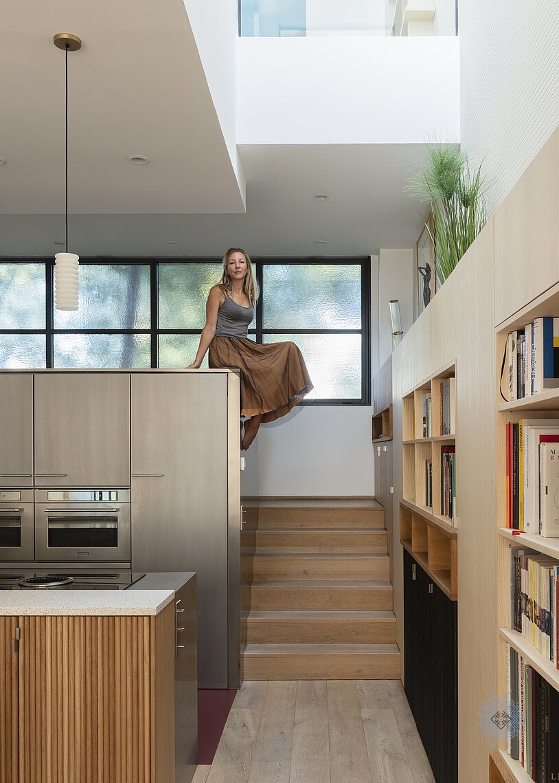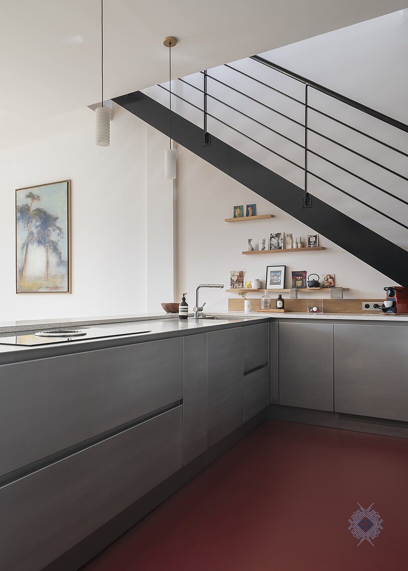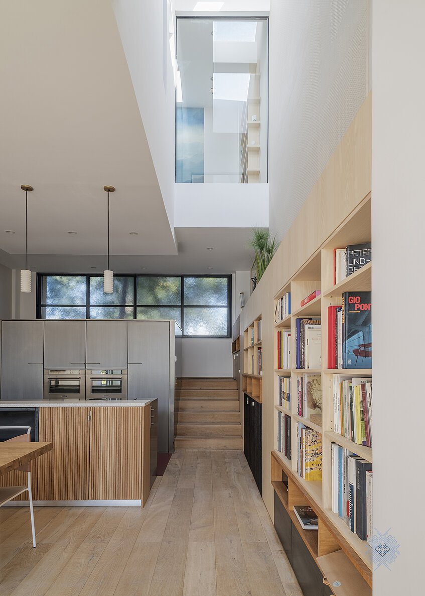 C'est une maison cachée au coeur d'un îlot, clin d'oeil à Mallet Stevens, elle en reprend la structure cubique, les volumes follement généreux et donne la part belle à la lumière. Une seule exposition était possible, mais la lumière est partout grâce des jeux subtiles de puits en toiture et de vitrages internes qui se répondent et la répercutent partout. Le plissé des stores sur-mesure joue avec les rayons. Les ouvertures en façade sont des cadrages sur une végétaion luxuriante, oubliant la ville. Il y a de l'Italie ici. Du Japon aussi. Et puis le tout est surtout très singulier. Du terrazzo, du chêne plissé, du frêne, une mosaique qui file sous 7 mètres de plafond de verre et guide le regard faisant rebondir chaque reflet de soleil d'un petit carreau à l'autre. Les lumières en albâtre adoucissent les reflets bleu gris de la cuisine tout inox posée sur un sol béton peint d'un rouge pompéien. Les références ponctuent les espaces et, si on les ignore, la vaste bibliothèque pensée comme comme un meuble de métier XXL vient nous les rappeler.