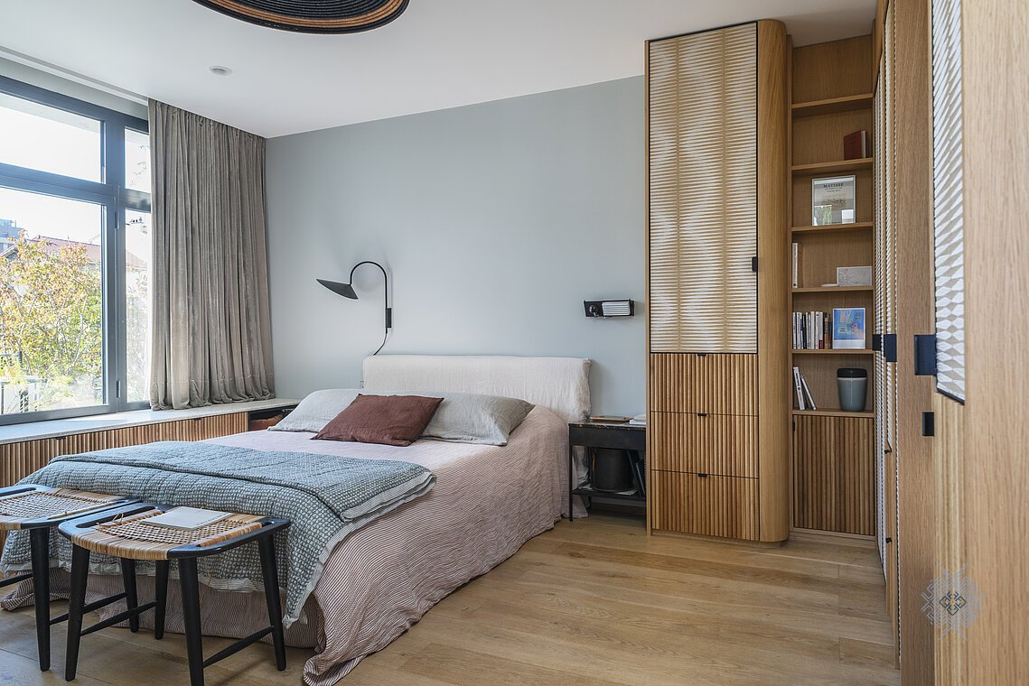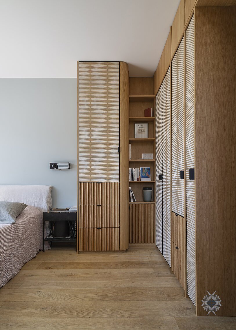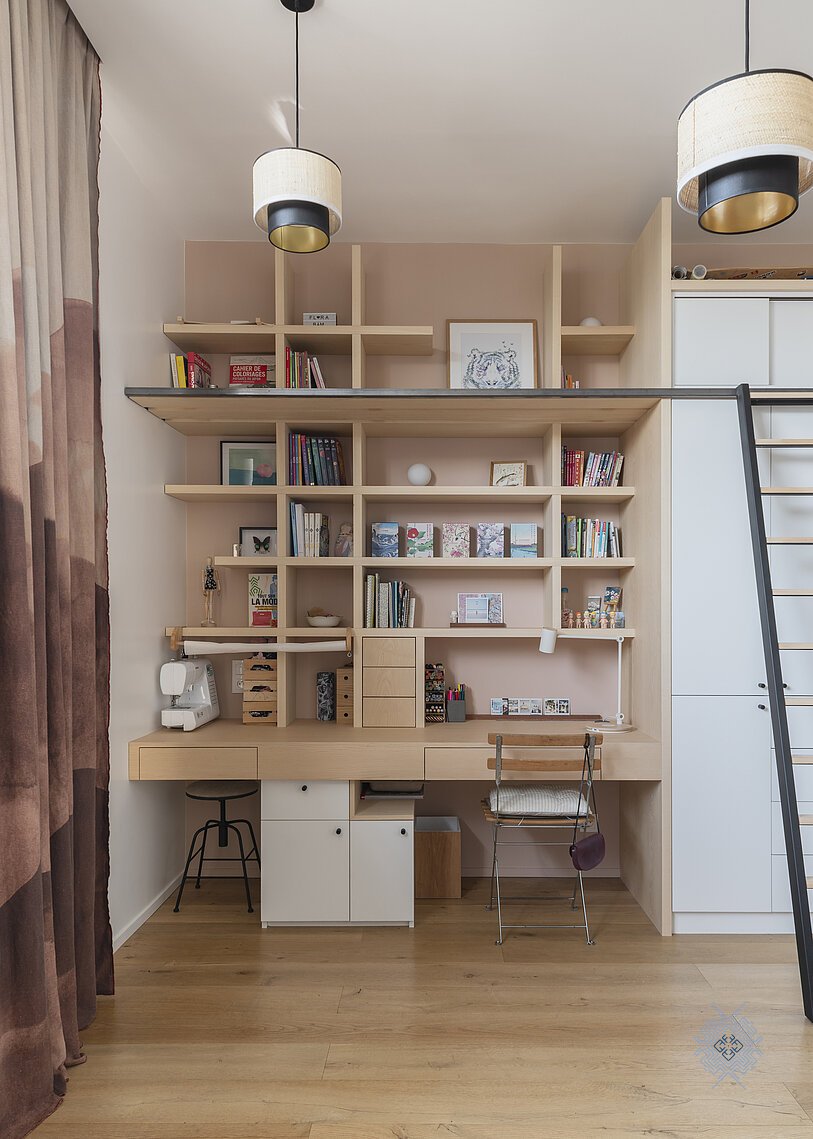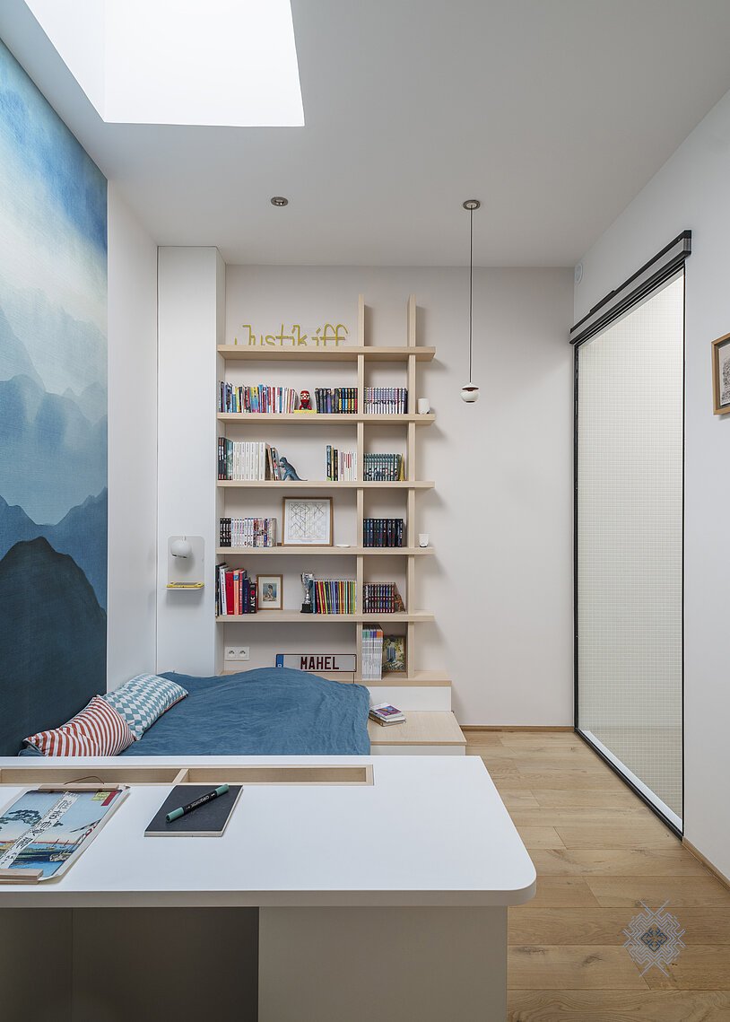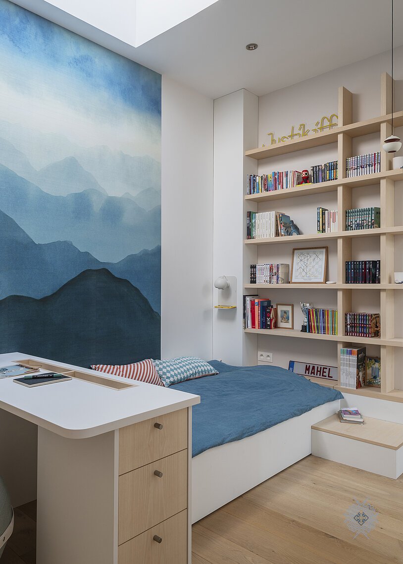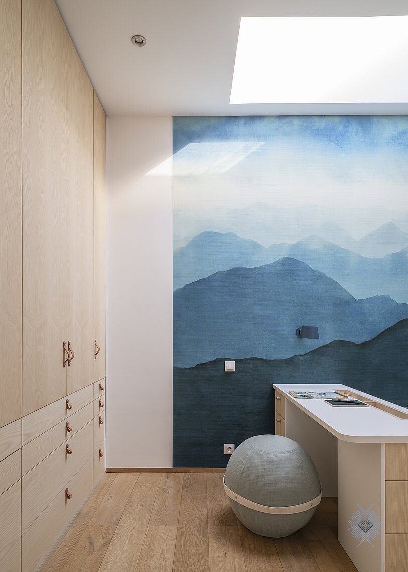 C'est une maison cachée au coeur d'un îlot, clin d'oeil à Mallet Stevens, elle en reprend la structure cubique, les volumes follement généreux et donne la part belle à la lumière. Une seule exposition était possible, mais la lumière est partout grâce des jeux subtiles de puits en toiture et de vitrages internes qui se répondent et la répercutent partout. Le plissé des stores sur-mesure joue avec les rayons. Les ouvertures en façade sont des cadrages sur une végétaion luxuriante, oubliant la ville. Il y a de l'Italie ici. Du Japon aussi. Et puis le tout est surtout très singulier. Du terrazzo, du chêne plissé, du frêne, une mosaique qui file sous 7 mètres de plafond de verre et guide le regard faisant rebondir chaque reflet de soleil d'un petit carreau à l'autre. Les lumières en albâtre adoucissent les reflets bleu gris de la cuisine tout inox posée sur un sol béton peint d'un rouge pompéien. Les références ponctuent les espaces et, si on les ignore, la vaste bibliothèque pensée comme comme un meuble de métier XXL vient nous les rappeler.