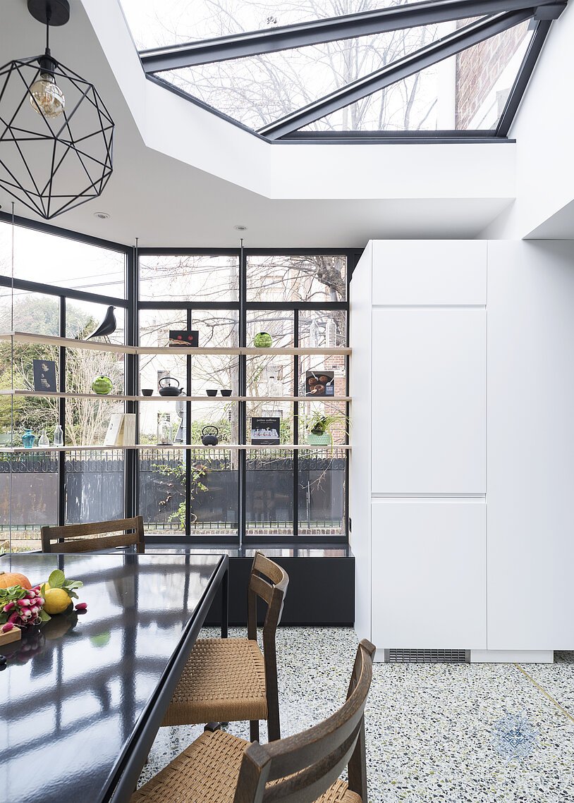 Les propriétaires souhaitaient créer une extension avec vue sur le jardin pour agrandir la zone de préparation de repas d'une part et accueillir un véritable espace pour les dîners en famille en profitant de la vue sur le jardin, été comme hiver. Les parents ayant transmis leur plaisir de cuisiner à leurs trois filles, cette pièce est devenue au fil des ans le coeur du foyer. Un coeur un peu trop étroit où l'espace de circulation et la zone technique exigus ne sont pas à la hauteur des motivations culinaires de ses occupants qui rêvent aussi qu'elle devienne un lieu de vie et d'échanges à part entière.