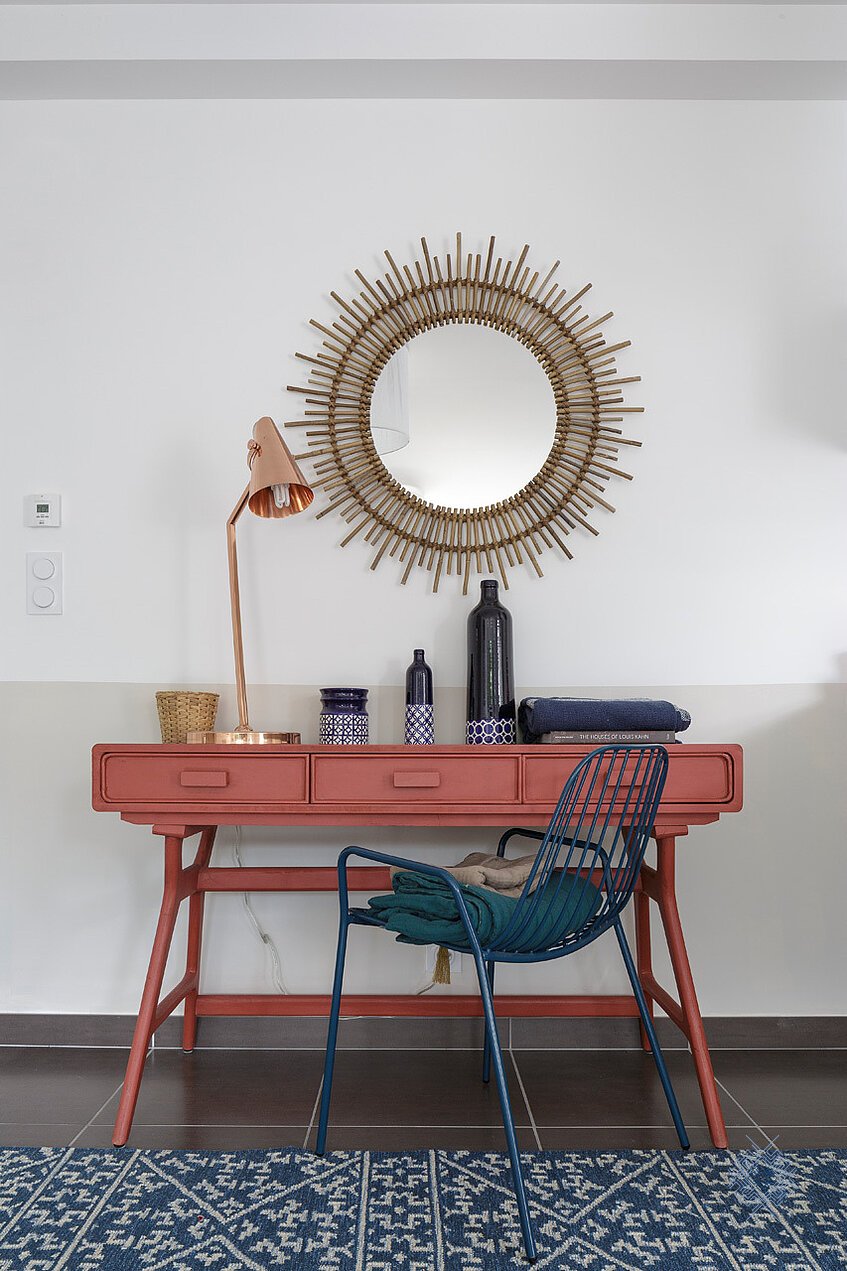Cette maison est conçue de plain pied sur le jardin et offre un vaste espace traversant et lumineux. Le cœur de la maison concentre les pièces de vie familiale autour d’un patio, distribuant un coin parental d’un côté et les chambres et salle de bain des enfants de l’autre. Le mobilier mixe du bois brut et du bois peint aux lignes contemporaines et parfois ethniques, voire japonisantes. Les matières choisies sont naturelles: lin, coton et laine. Les couleurs sont douces et proposent une variation de blanc ponctuée de touches de couleurs accents, très vives par contraste. Résultat: un espace reposant mais vivifiant!