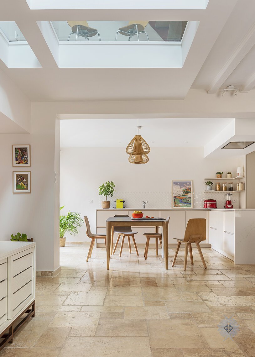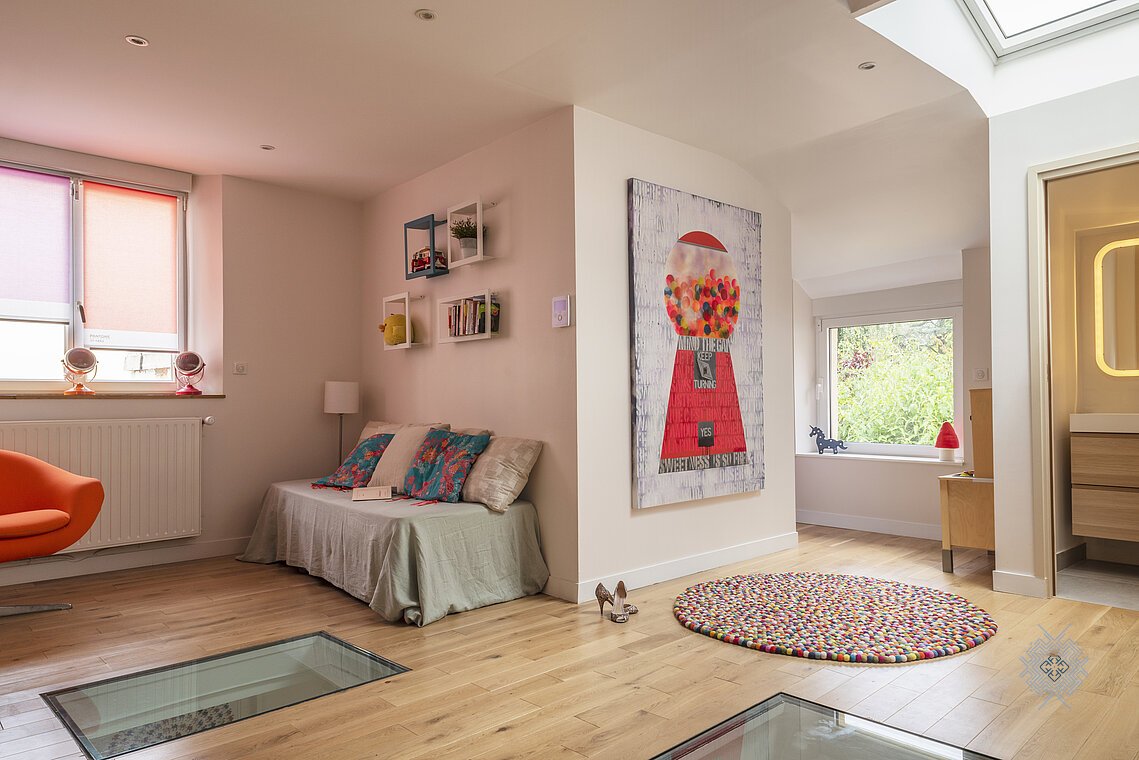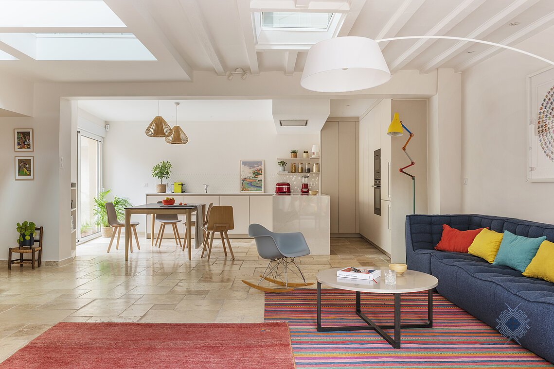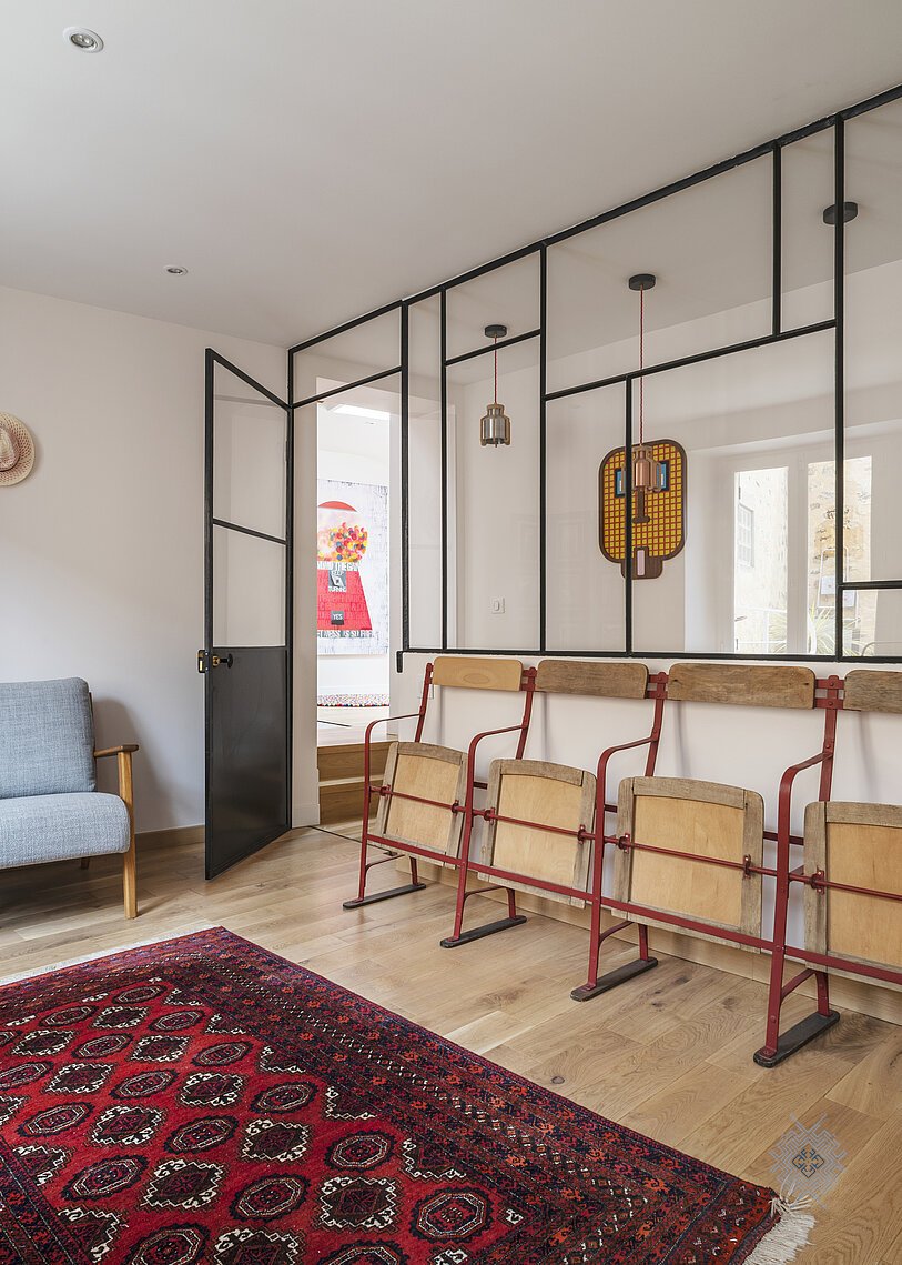 Cet ancien théâtre réunissait trois corps de bâtiments disparates autour d'une cour intérieure. Sa réhabilitation est devenue une vraie mise en scène familiale. Les bâtiments communiquaient sans unité, avec des percements qui mettaient à nu les différences de niveaux de sols et de plafonds. Le premier des défis était d'établir un programme de rénovation redonnant des fonctions claires aux différents espaces très généreux, réorganisant les circulations et en priorité l'emplacement de l'entrée principale de la maison et celle de l'escalier qui dessert trois niveaux tout en redéfinissant les espaces interstitiels entre les chambres des trois filles, la suite parentale et un open space familial! Tout cela en donnant la part belle à la lumière naturelle, grande oubliée de l'histoire jusqu'alors!