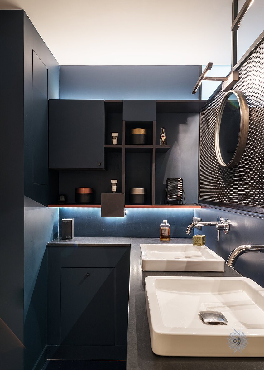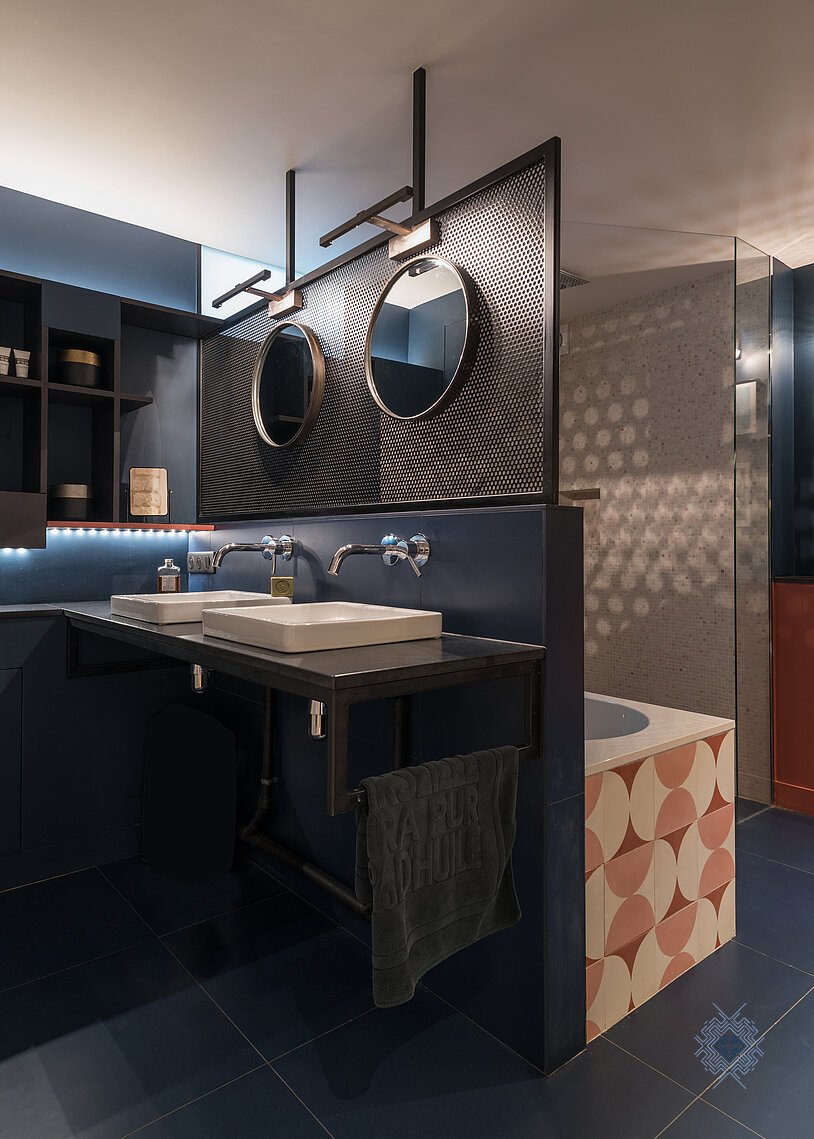 La salle de bains familiale est l'unique pièce d'eau de la maison. Sa taille a permis de concevoir un vrai salon de bain en segmentant les différentes fonctions buanderie, coin vasques, douche et bain, et enfin les WC sans cloisonner l'espace.