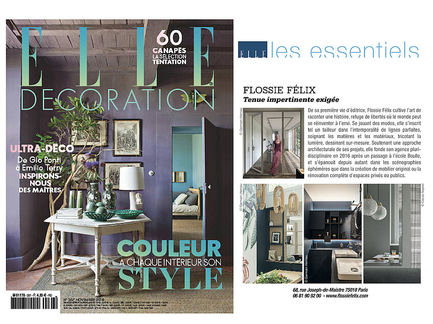 Éditrice dans une grande maison de Littérature et de Sciences Humaines pendant quinze ans, Flossie Félix a aidé les écrivains à planter leur décor jusqu’à avoir envie de le faire pour de vrai! Raconter une histoire, dialoguer avec l’autre, accueillir les mots sur une page, soigner les blancs tournants, les espacements, les interlignages, choisir une typographie, un papier, finalement ces aspects ne sont pas si éloignés de la réflexion d’un décorateur. Écrire et habiter sont des actes qui relèvent de l’intime et qui sont aussi faits pour être partagés. Elle fonde son agence en septembre 2016 après une formation en design d’intérieur à l’école Boulle.