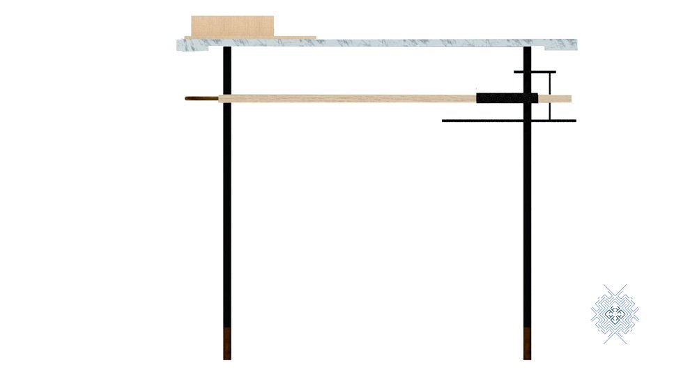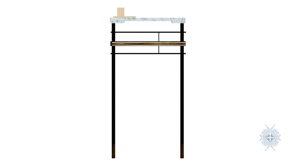 marbre blanc de Carrare, fer forgé, chêne, laiton