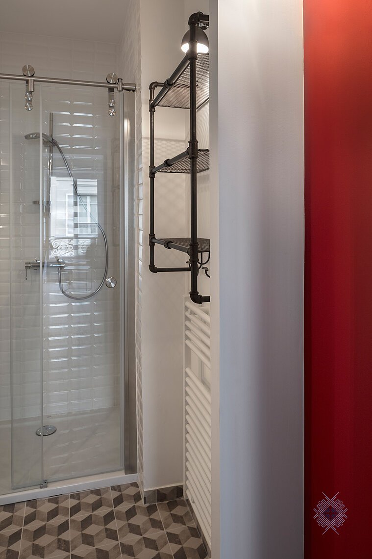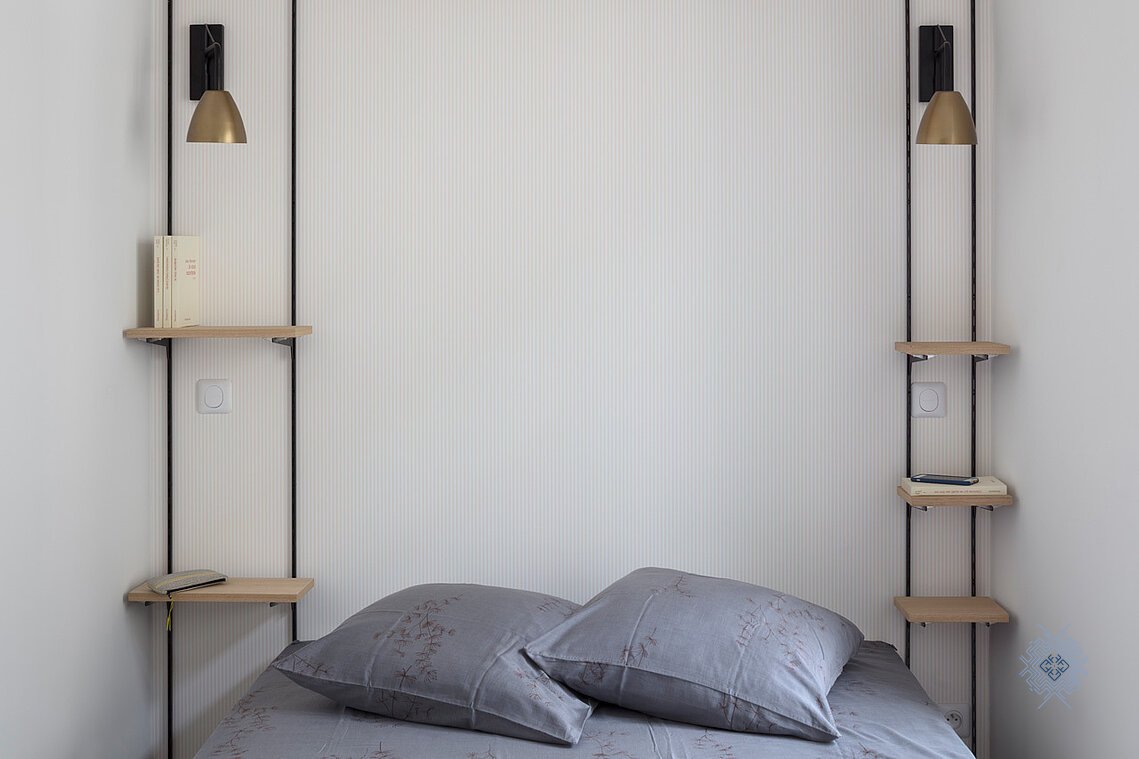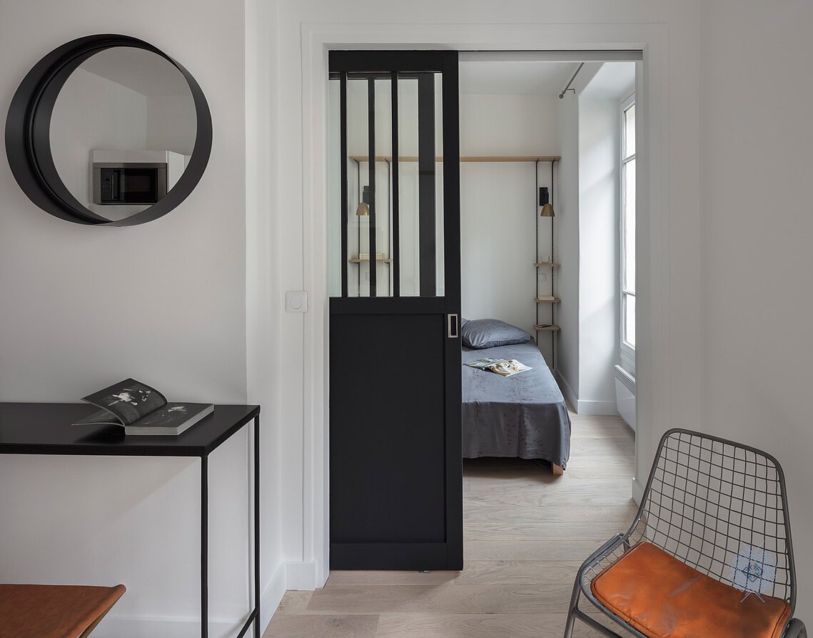 Rénovation complète pour ce petit deux-pièces de 28 m2 rue Saint-Dominique, destiné à la location. L'idée maîtresse était de libérer la lumière pour la laisser courir jusqu'au fond de l'appartement en ne fermant les espaces qu'avec des portes vitrées. Des agencements sur-mesure dessinés à partir de crémaillères et de tablettes ont été conçus à partir de lignes épurées pour ne pas encombrer ce petit espace.