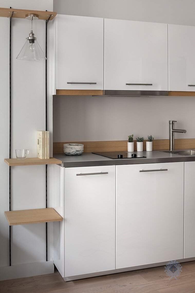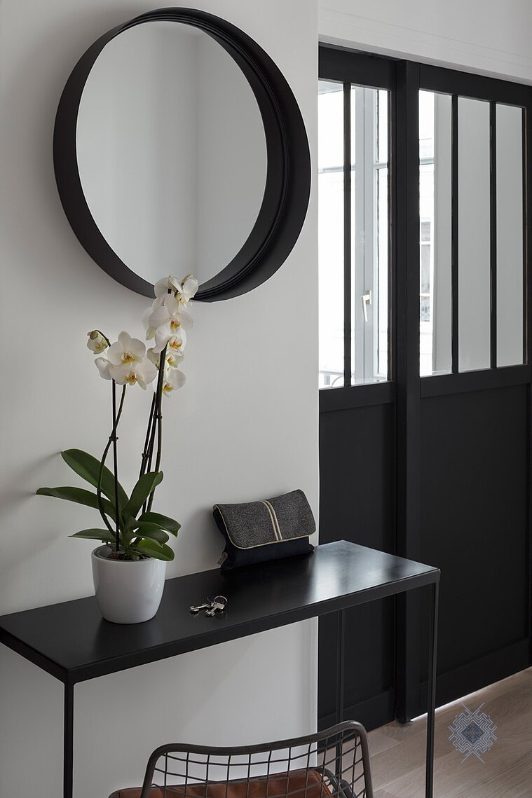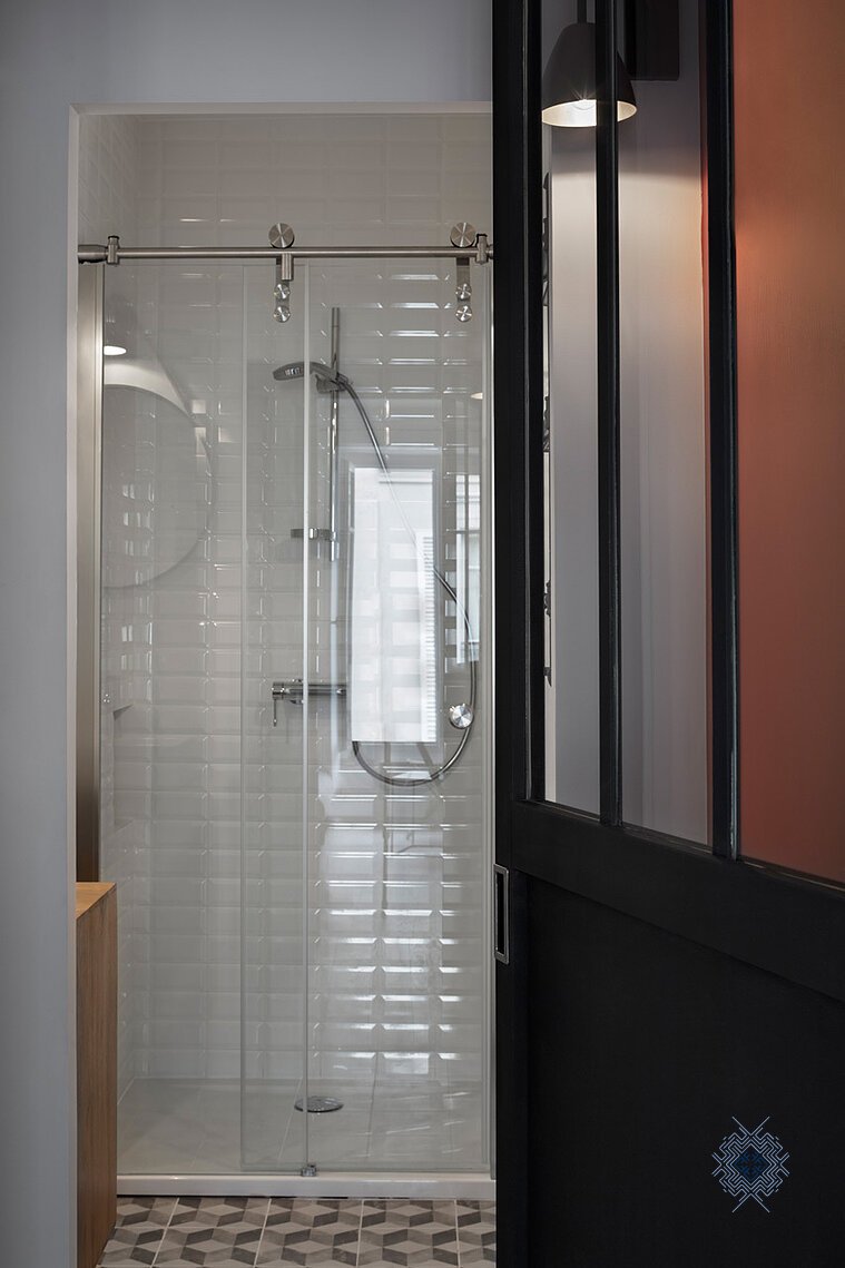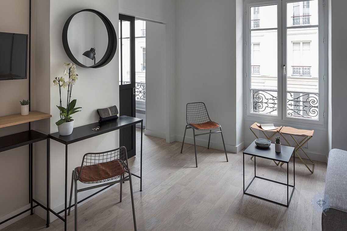 Rénovation complète pour ce petit deux-pièces de 28 m2 rue Saint-Dominique, destiné à la location. L'idée maîtresse était de libérer la lumière pour la laisser courir jusqu'au fond de l'appartement en ne fermant les espaces qu'avec des portes vitrées. Des agencements sur-mesure dessinés à partir de crémaillères et de tablettes ont été conçus à partir de lignes épurées pour ne pas encombrer ce petit espace.