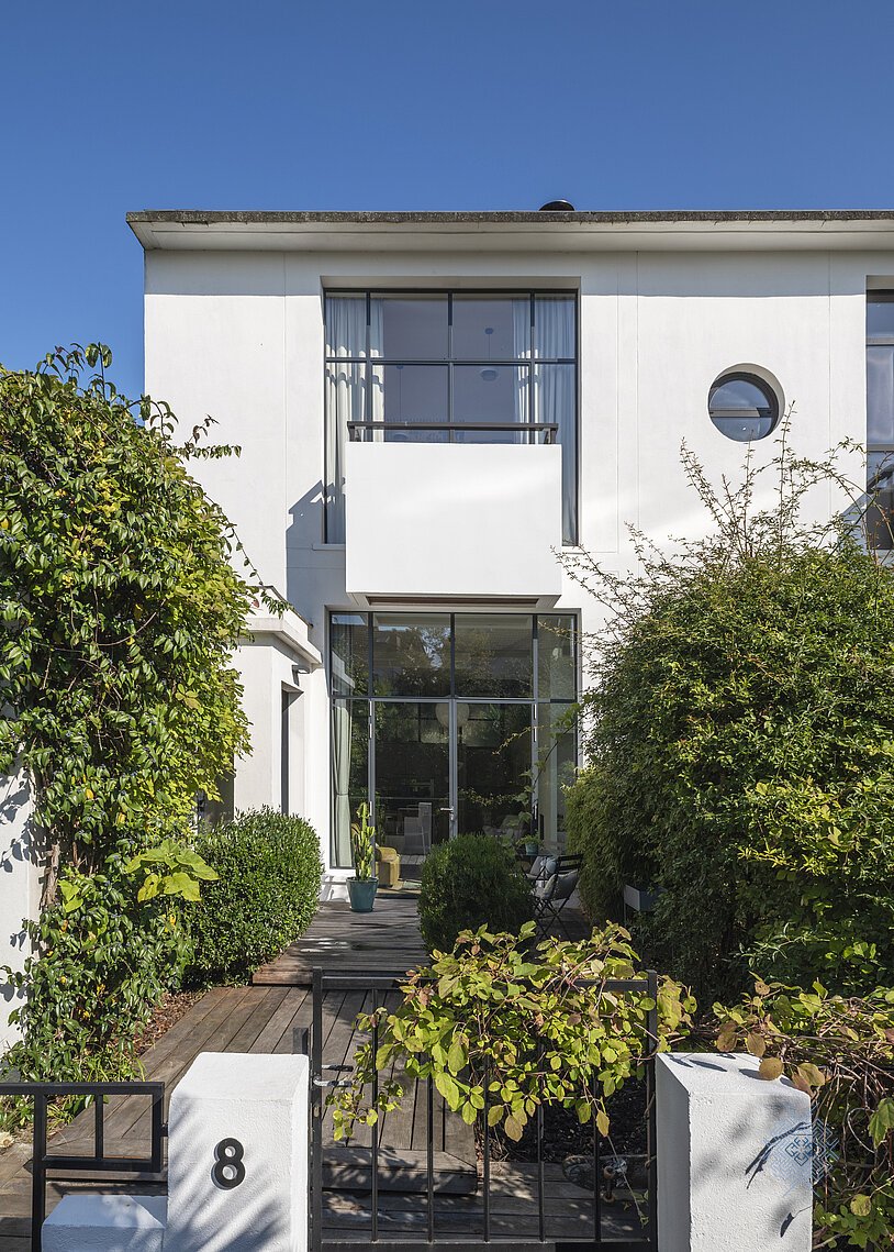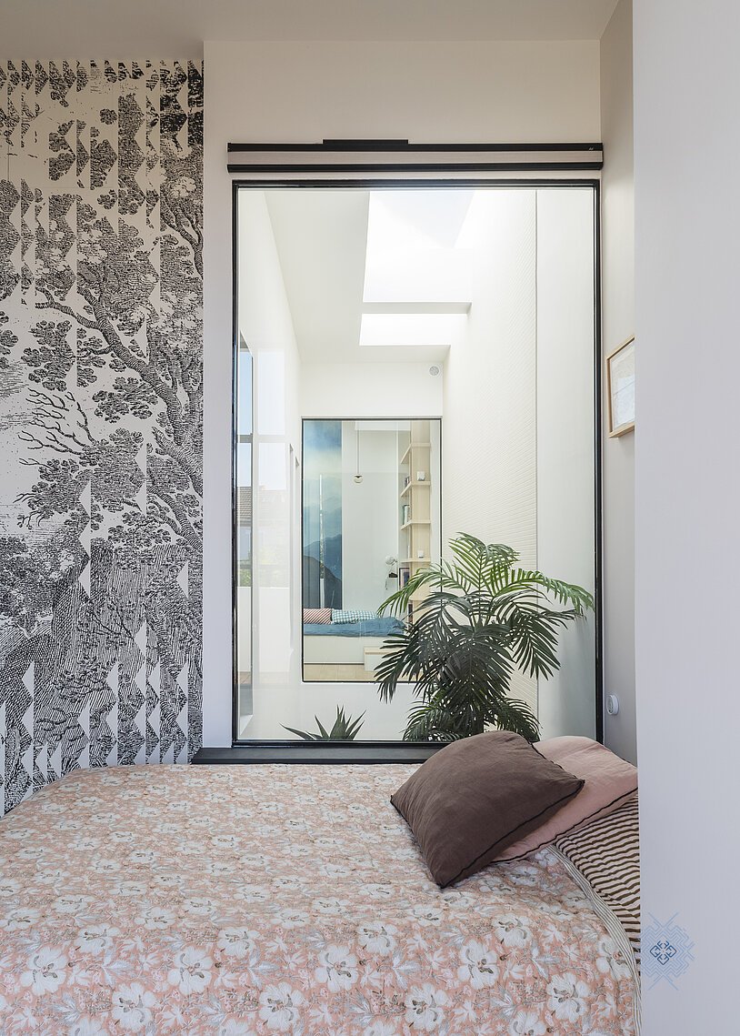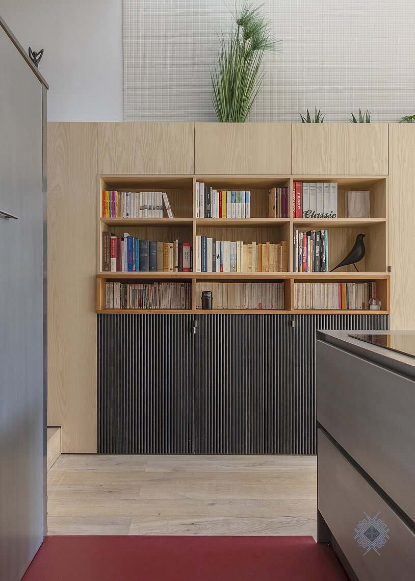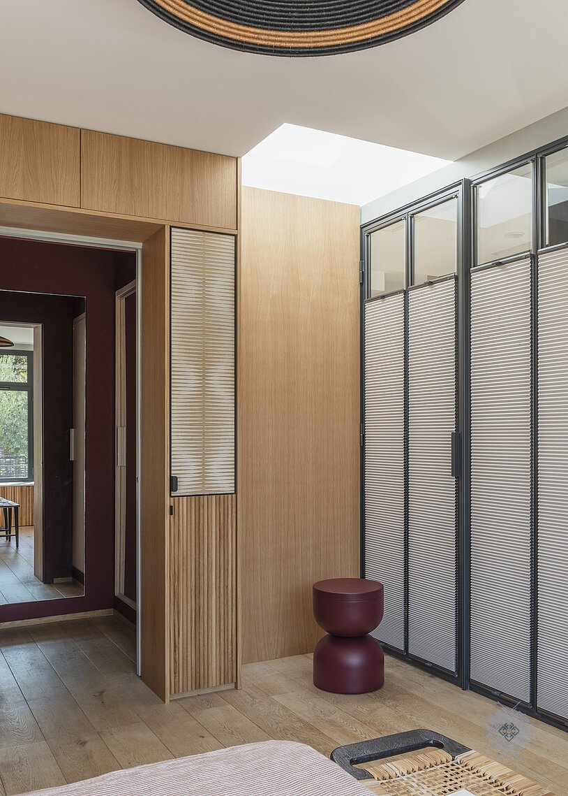 C'est une maison cachée au coeur d'un îlot, clin d'oeil à Mallet Stevens, elle en reprend la structure cubique, les volumes follement généreux et donne la part belle à la lumière. Une seule exposition était possible, mais la lumière est partout grâce des jeux subtiles de puits en toiture et de vitrages internes qui se répondent et la répercutent partout. Le plissé des stores sur-mesure joue avec les rayons. Les ouvertures en façade sont des cadrages sur une végétaion luxuriante, oubliant la ville. Il y a de l'Italie ici. Du Japon aussi. Et puis le tout est surtout très singulier. Du terrazzo, du chêne plissé, du frêne, une mosaique qui file sous 7 mètres de plafond de verre et guide le regard faisant rebondir chaque reflet de soleil d'un petit carreau à l'autre. Les lumières en albâtre adoucissent les reflets bleu gris de la cuisine tout inox posée sur un sol béton peint d'un rouge pompéien. Les références ponctuent les espaces et, si on les ignore, la vaste bibliothèque pensée comme comme un meuble de métier XXL vient nous les rappeler.