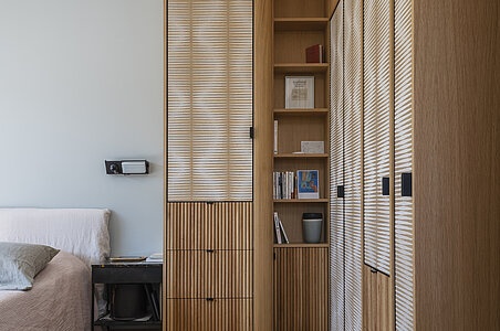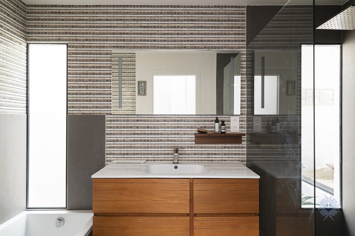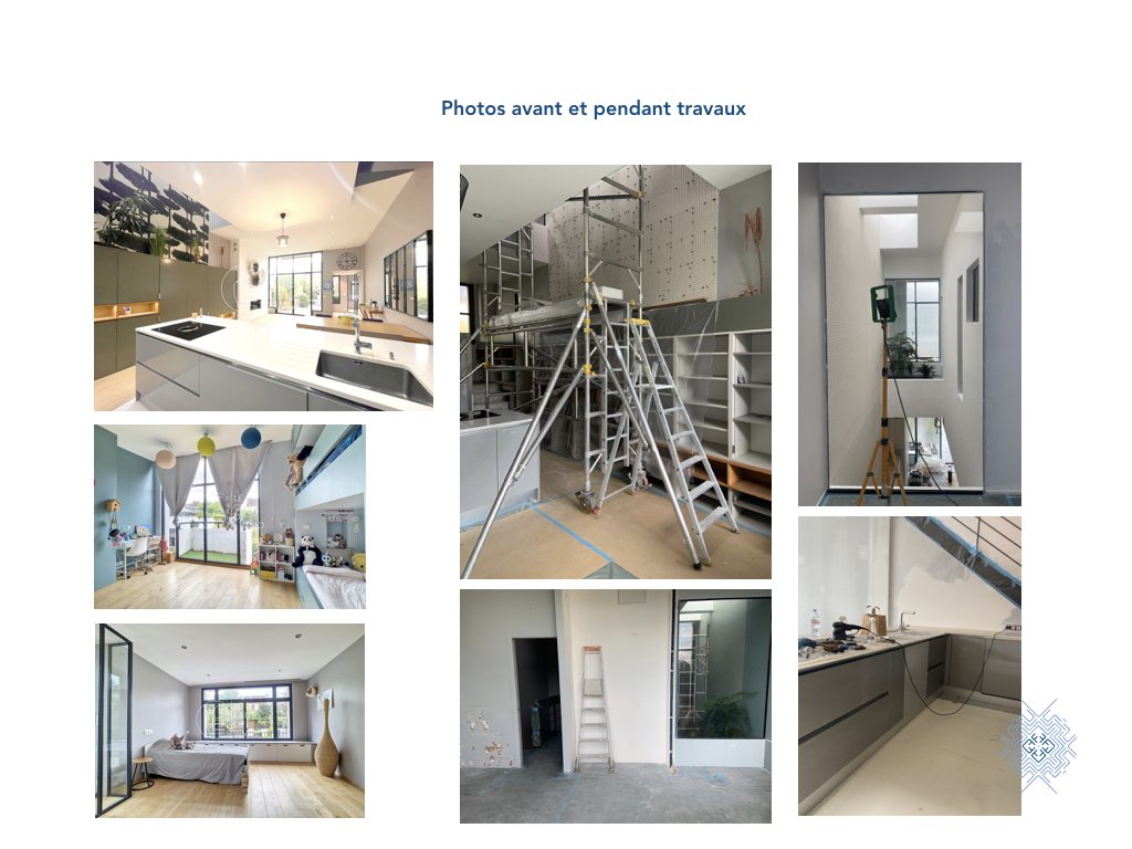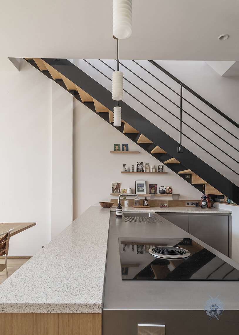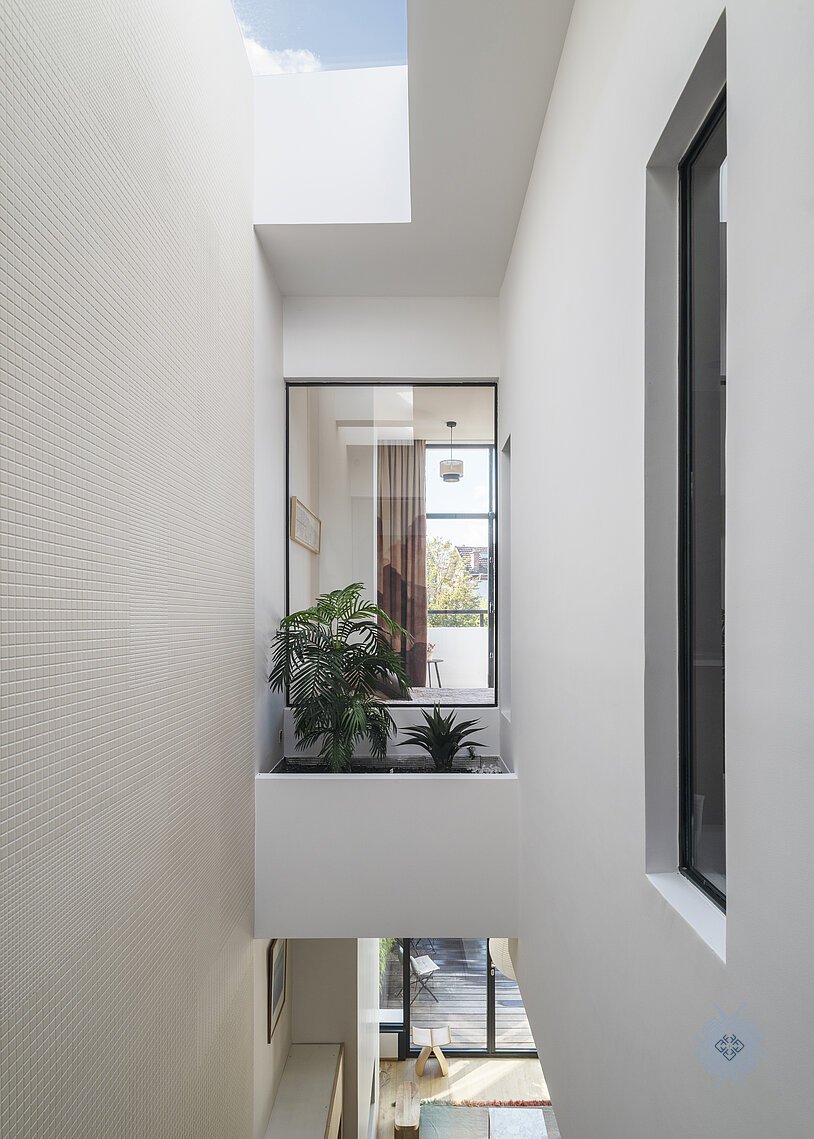 C'est une maison cachée au coeur d'un îlot, clin d'oeil à Mallet Stevens, elle en reprend la structure cubique, les volumes follement généreux et donne la part belle à la lumière. Une seule exposition était possible, mais la lumière est partout grâce des jeux subtiles de puits en toiture et de vitrages internes qui se répondent et la répercutent partout. Le plissé des stores sur-mesure joue avec les rayons. Les ouvertures en façade sont des cadrages sur une végétaion luxuriante, oubliant la ville. Il y a de l'Italie ici. Du Japon aussi. Et puis le tout est surtout très singulier. Du terrazzo, du chêne plissé, du frêne, une mosaique qui file sous 7 mètres de plafond de verre et guide le regard faisant rebondir chaque reflet de soleil d'un petit carreau à l'autre. Les lumières en albâtre adoucissent les reflets bleu gris de la cuisine tout inox posée sur un sol béton peint d'un rouge pompéien. Les références ponctuent les espaces et, si on les ignore, la vaste bibliothèque pensée comme comme un meuble de métier XXL vient nous les rappeler.