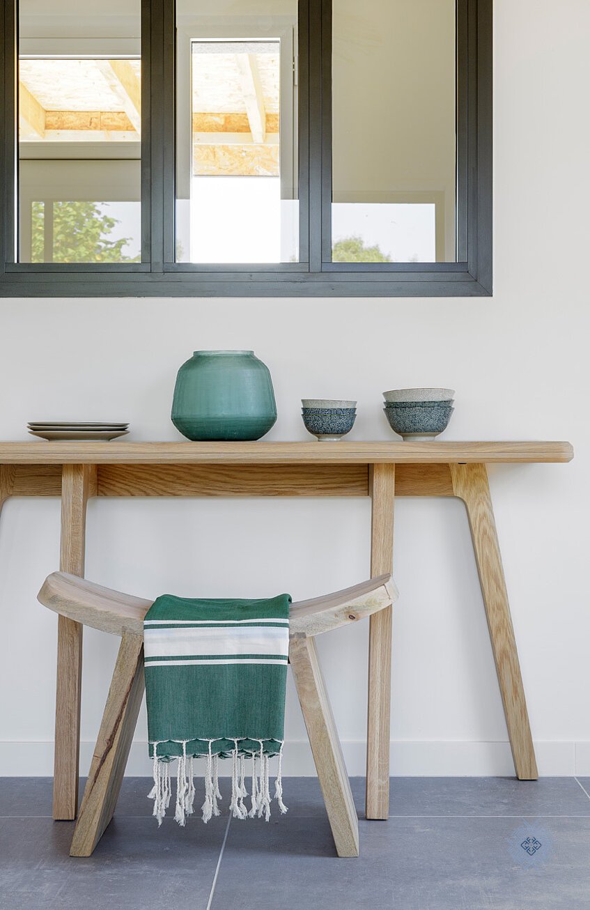 Conception des plans, choix des matériaux, suivi de chantier et ameublement d’une maison d’amis de 40m2. Conçu comme un vaste studio en conservant l’esprit maison de vacances, l’espace est largement ouvert sur l’extérieur et a été entièrement déplafonné pour profiter de la charpente du toit à quatre pentes en pointe diamant. Des lignes de métal noir dans le mobilier, le poêle Starck ou la verrière intérieure viennent scénariser l'espace et contraster avec le blanc dominant. Le canapé, un lé de papier peint Hermès et une partie de murs de la cuisine sont traités dans des tonalité chaudes, kaki et ocre, qui viennent réchauffer et affirmer la singularité de ce studio.