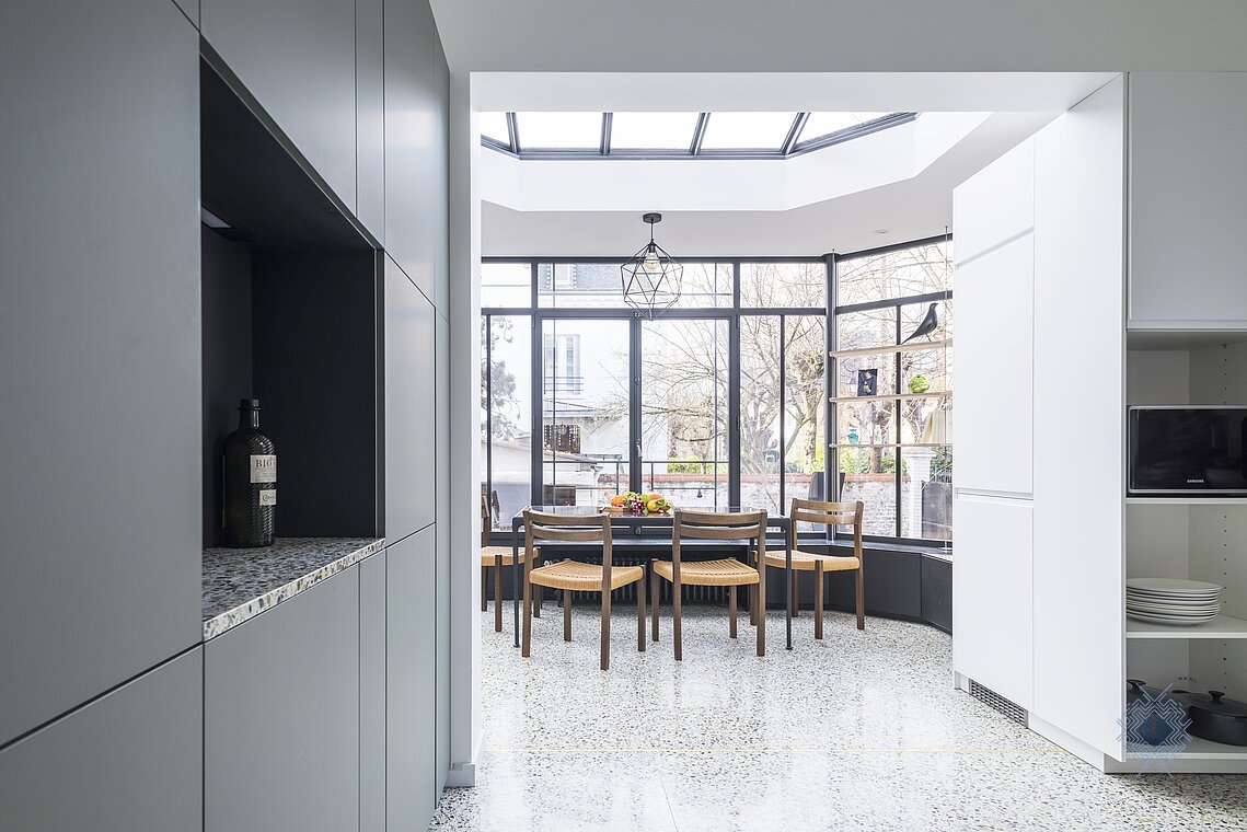 Création d'une extension pour offrir une véritable cuisine dinatoire largement ouverte sur le jardin agréable été comme hiver.