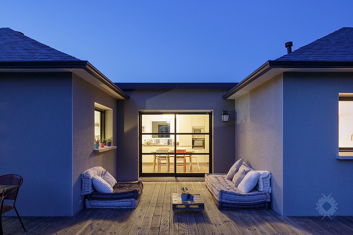 Cette maison est conçue de plain pied sur le jardin et offre un vaste espace traversant et lumineux. Le cœur de la maison concentre les pièces de vie familiale autour d’un patio, distribuant un coin parental d’un côté et les chambres et salle de bain des enfants de l’autre. Le mobilier mixe du bois brut et du bois peint aux lignes contemporaines et parfois ethniques, voire japonisantes. Les matières choisies sont naturelles: lin, coton et laine. Les couleurs sont douces et proposent une variation de blanc ponctuée de touches de couleurs accents, très vives par contraste. Résultat: un espace reposant mais vivifiant!