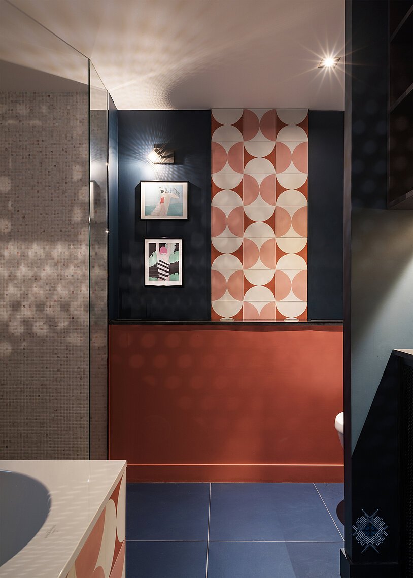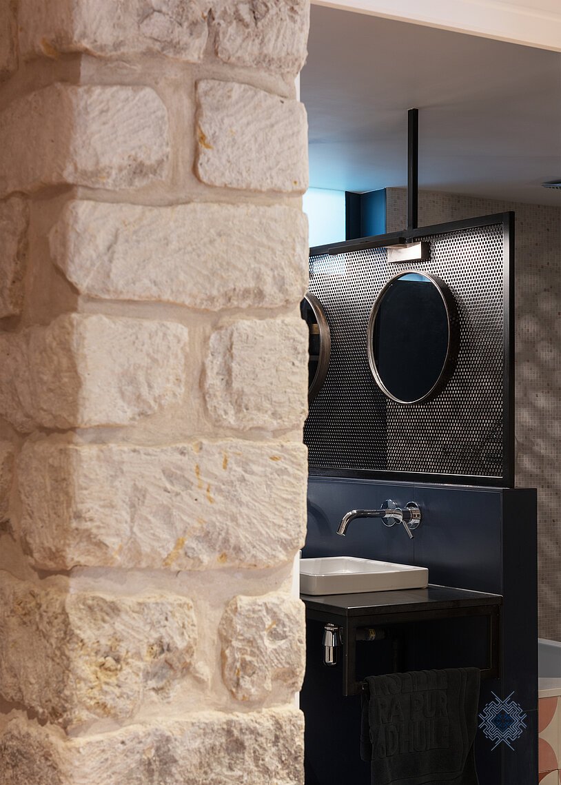 La salle de bains familiale est l'unique pièce d'eau de la maison. Sa taille a permis de concevoir un vrai salon de bain en segmentant les différentes fonctions buanderie, coin vasques, douche et bain, et enfin les WC sans cloisonner l'espace.