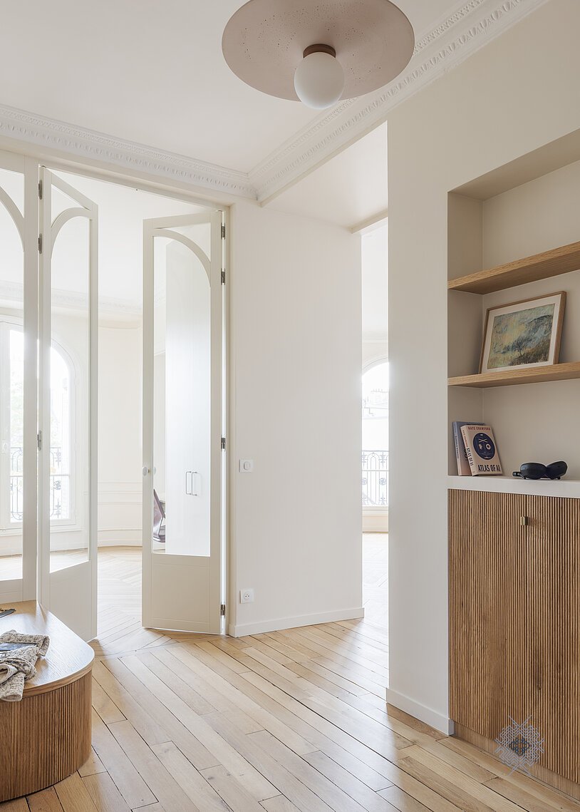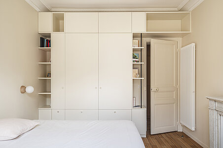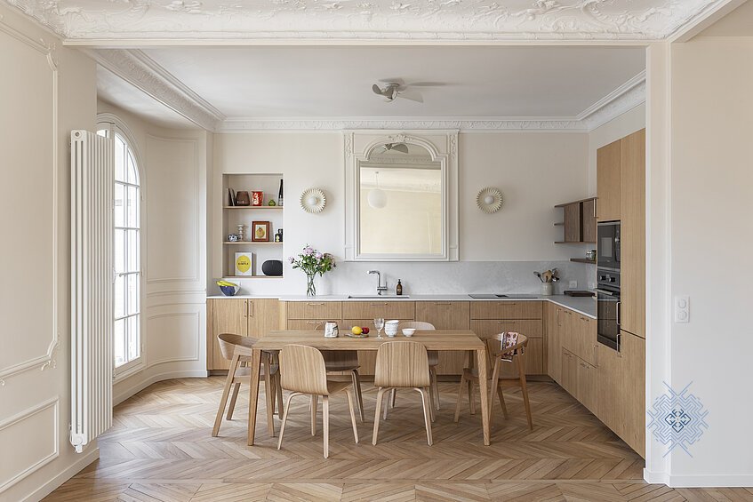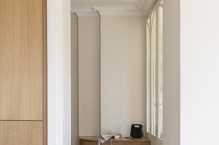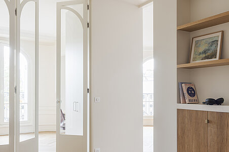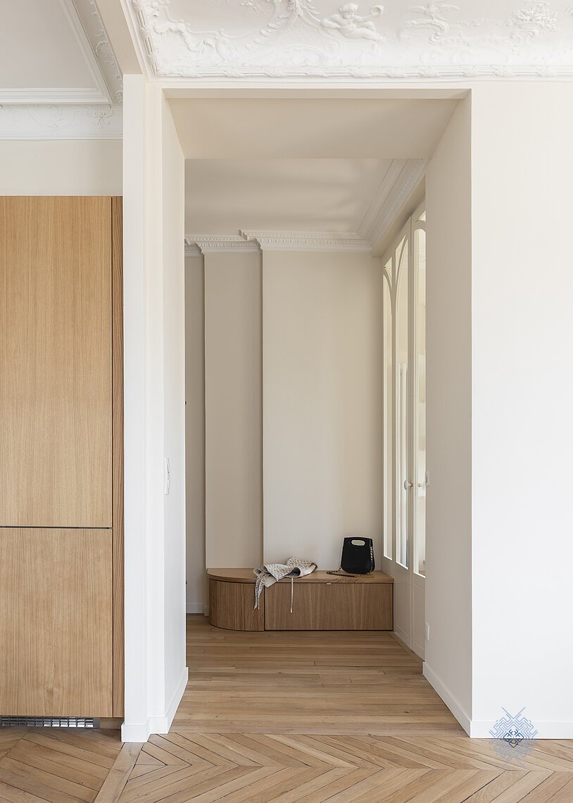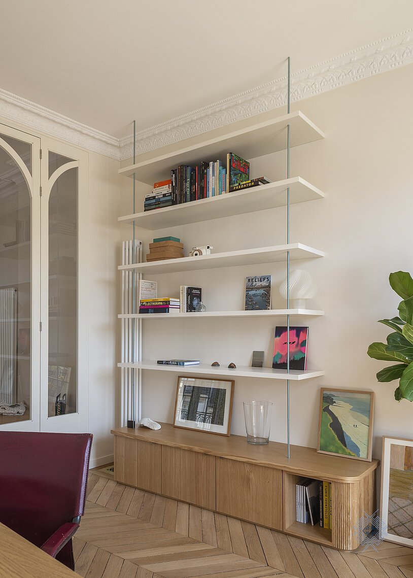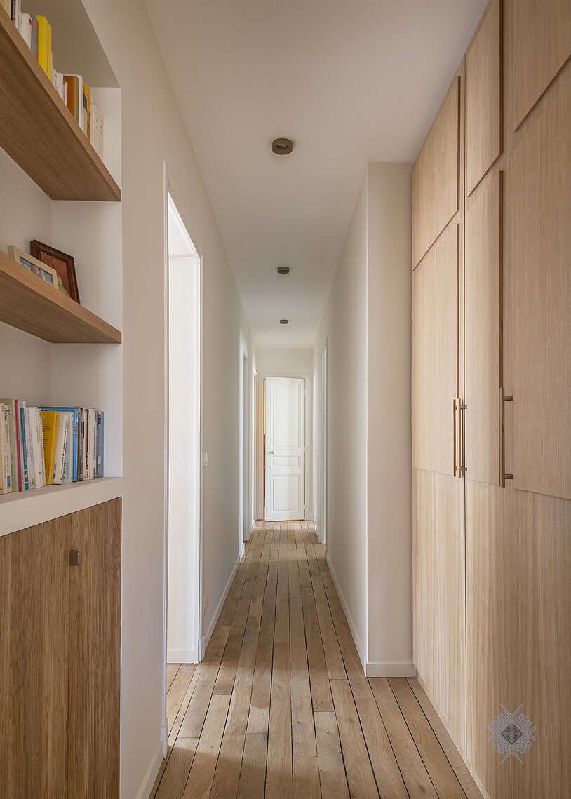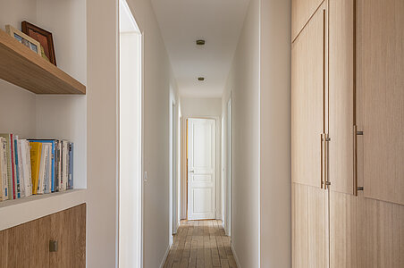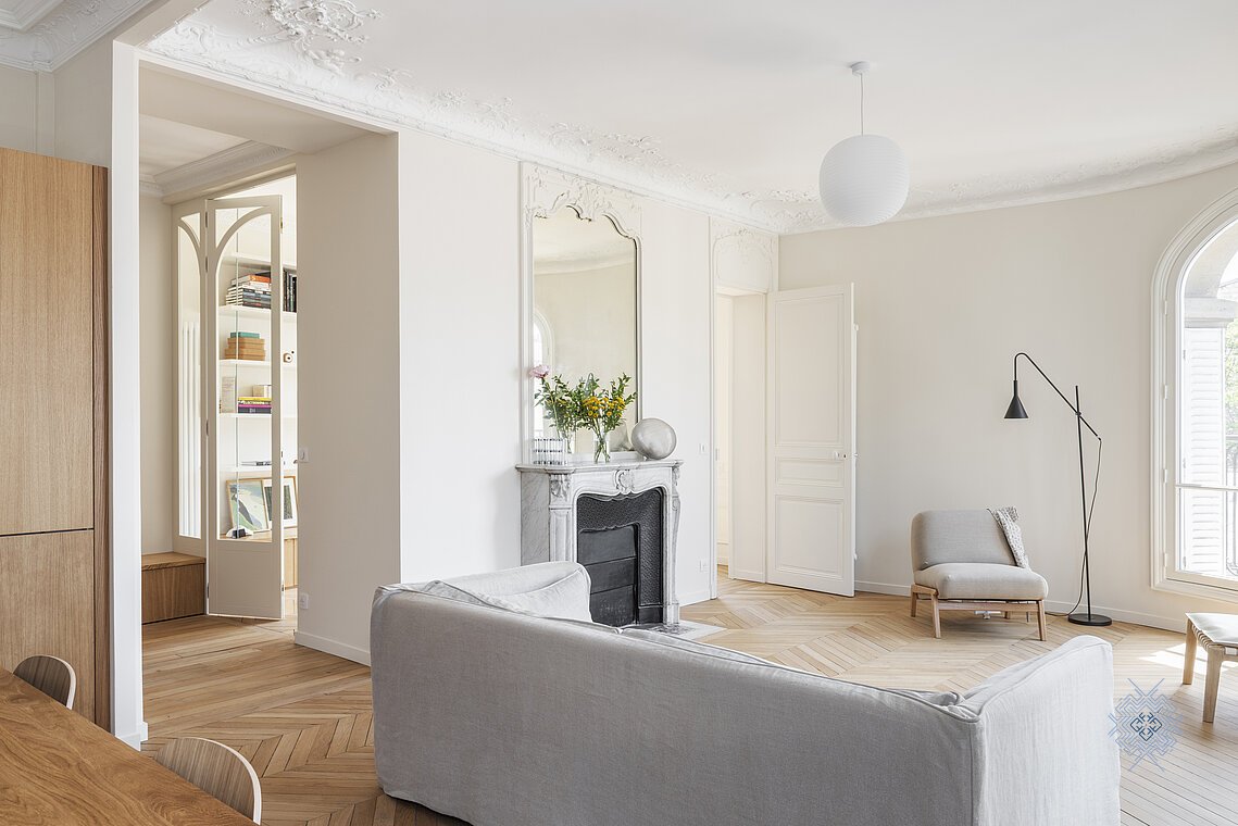 Ce bel appartement haussmanien tapissé de livres et totalement dans son jus, s'est offert un second souffle après son acquisition par une famille avec deux jeunes enfants. Le caractètre patrimonial a été préservé et valorisé: le plan d'origine a été conservé avec son mur de refend qui détermine le long couloir central desservant les chambres. Le parquet d'origine a été rejonté, poncé et ciré. Les moulures ont été allégées et les cheminées gardées en quasi totalité. L'organisation spatiale a été repensée pour être fidèle aux nouveaux usages. La cuisine s'est installée dans les pièces de réception, totalement ouvertes et menant à un bureau désormais vitré sur l'entrée. Une circulation totale de la lumière qui suit le cheminement de ses occupants. L'ancienne cuisine est désormais une deuxième salle de bain dédiée aux enfants, profitant d'une fenêtre sur cour et donnant sur une vaste buanderie conservant l'ancienne porte de service qui donnait dans l'ancienne cuisine.