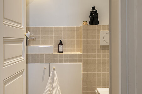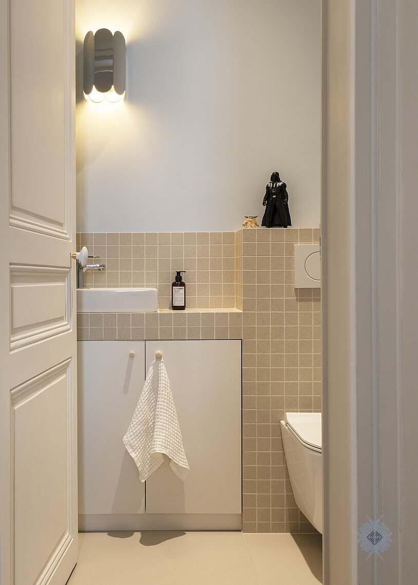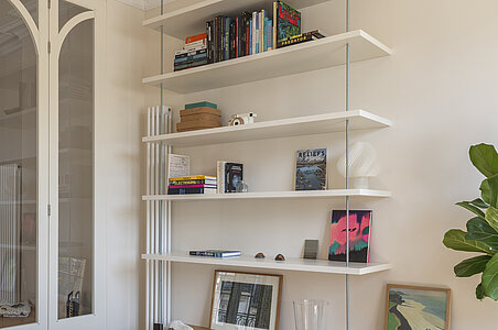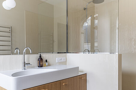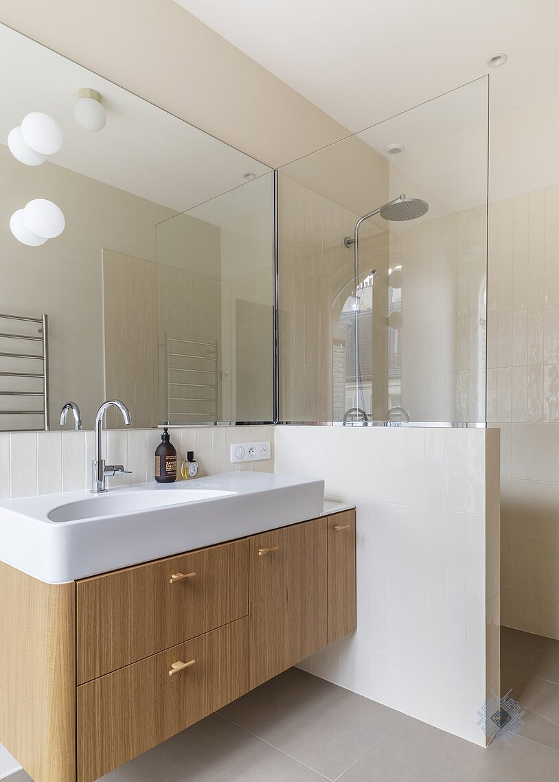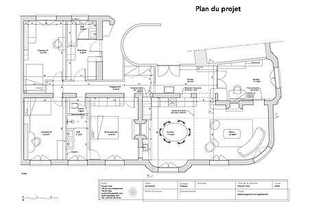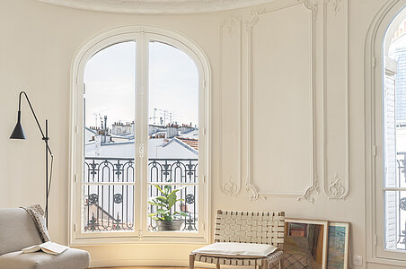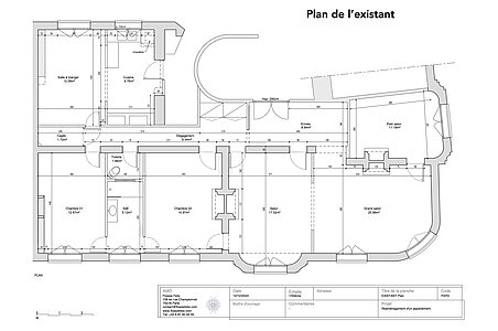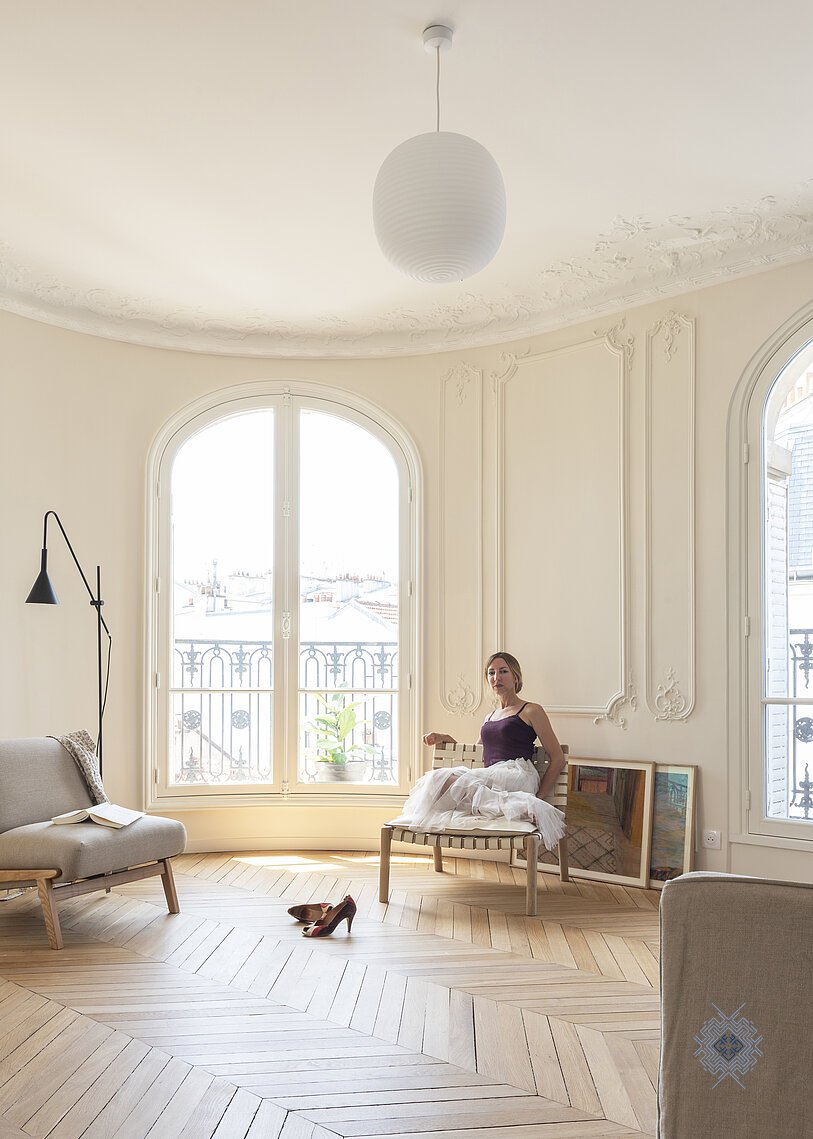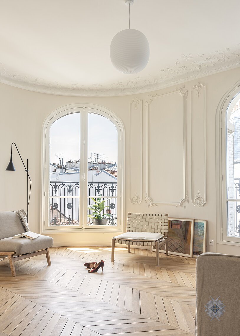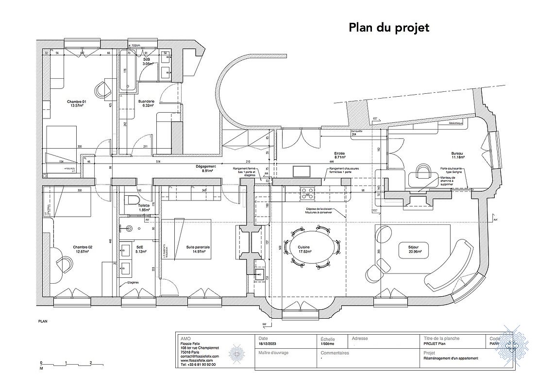 Ce bel appartement haussmanien tapissé de livres et totalement dans son jus, s'est offert un second souffle après son acquisition par une famille avec deux jeunes enfants. Le caractètre patrimonial a été préservé et valorisé: le plan d'origine a été conservé avec son mur de refend qui détermine le long couloir central desservant les chambres. Le parquet d'origine a été rejonté, poncé et ciré. Les moulures ont été allégées et les cheminées gardées en quasi totalité. L'organisation spatiale a été repensée pour être fidèle aux nouveaux usages. La cuisine s'est installée dans les pièces de réception, totalement ouvertes et menant à un bureau désormais vitré sur l'entrée. Une circulation totale de la lumière qui suit le cheminement de ses occupants. L'ancienne cuisine est désormais une deuxième salle de bain dédiée aux enfants, profitant d'une fenêtre sur cour et donnant sur une vaste buanderie conservant l'ancienne porte de service qui donnait dans l'ancienne cuisine.